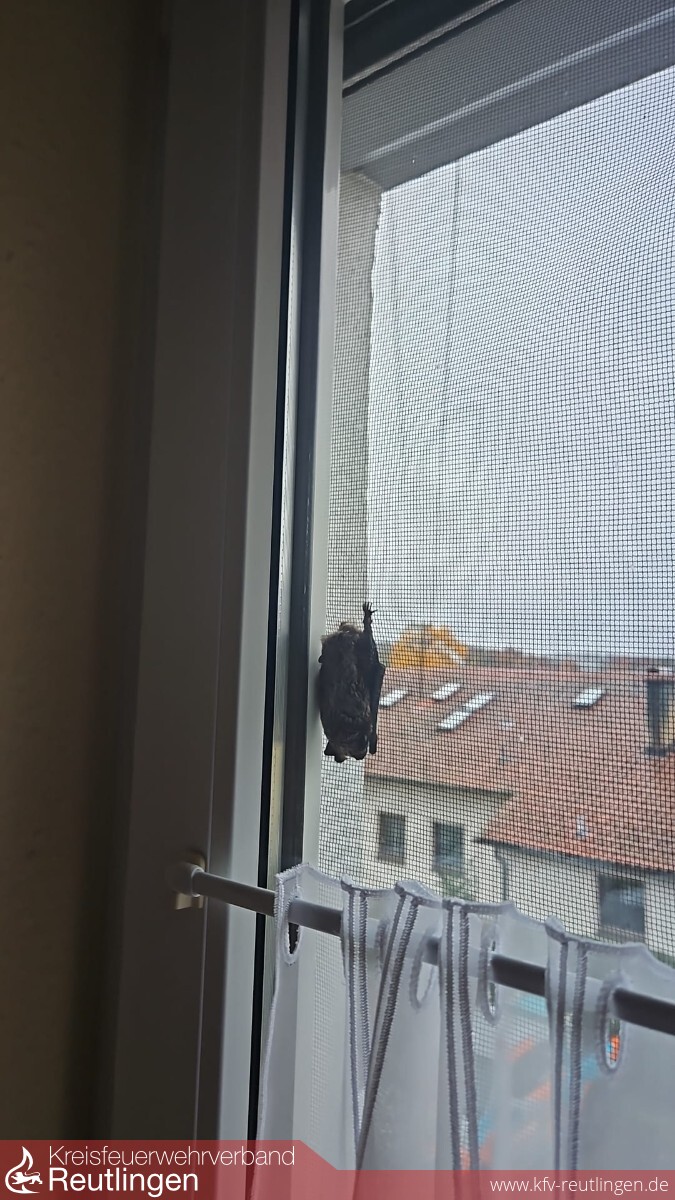 Zu einem nicht alltäglichen Einsatz wurde die Abteilung Ohnastetten am 02.11.25 gegen 11:15 Uhr in die Weidenstraße alarmiert. Vor Ort stellte sich heraus, dass sich eine Fledermaus zwischen eine Fensterscheibe und ein außen am Fenster angebrachtes Fliegengitter im 1. Obergeschoss verirrt hatte. Sie hatte sich so unglücklich verfangen, dass aus eigener Kraft kein Entkommen mehr möglich war. Mittels tragbarer Leiter kletterten die Kameraden zu dem Fenster und entfernten vorsichtig das Fliegengitter. Nach rund 15 Minuten war Batman – wie die Fledermaus mittlerweile vom Bewohner getauft worden war – gerettet und konnte wohlbehalten auf einem Holzstapel abgesetzt werden, von dem aus sie sich nach kurzer Zeit aus eigener Kraft entfernte.