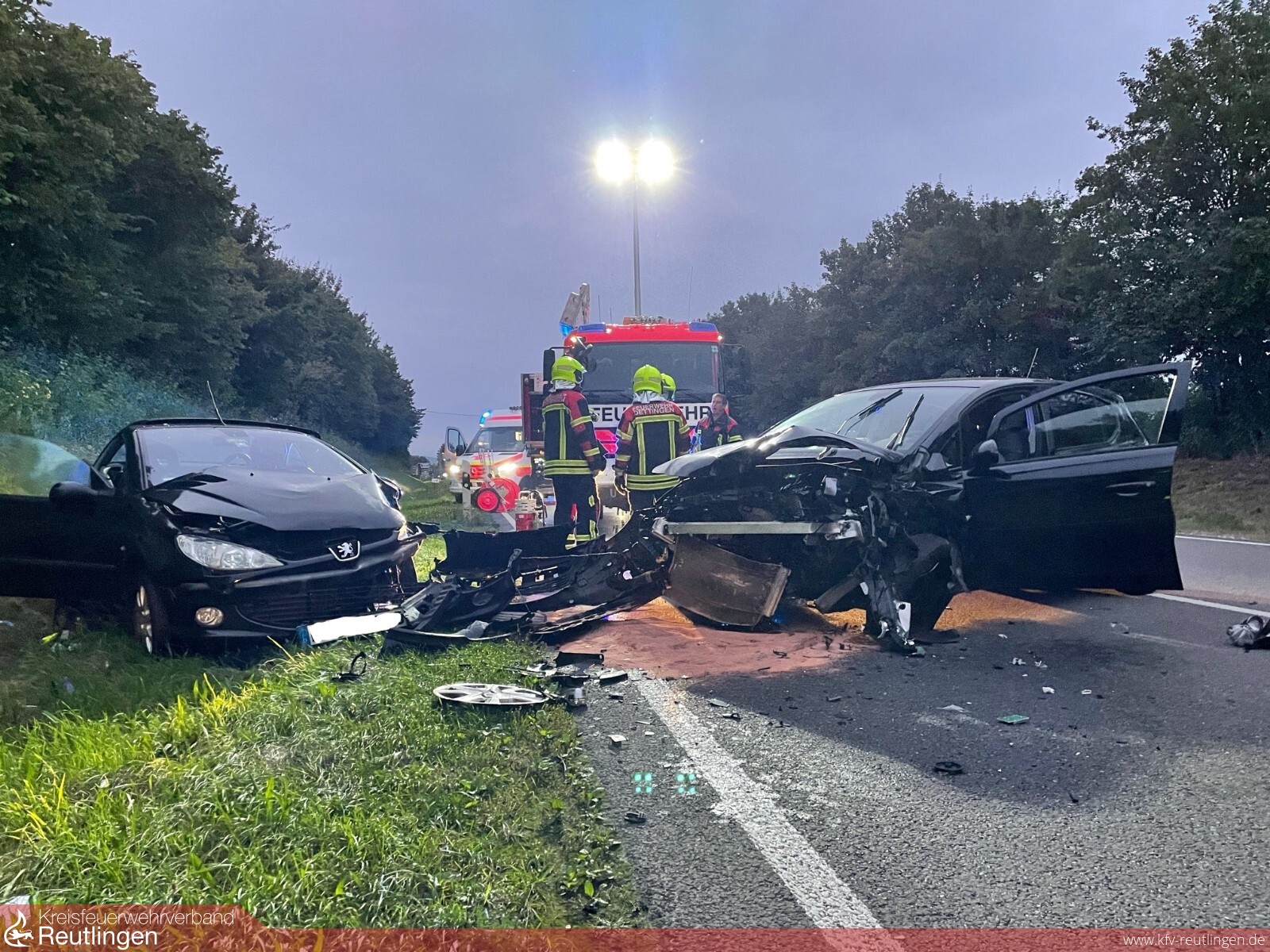 Zwei Schwerverletzte und ein Sachschaden von etwa 11.000 Euro sind die Folgen eines Verkehrsunfalls, der sich am Montagmorgen auf der B 28 zwischen den Abfahrten Bad Urach Bleiche und Metzingen-Neuhausen ereignet hat. Eine 32-Jährige war gegen 6.20 Uhr mit ihrem Opel Corsa auf der Bundesstraße von Bad Urach in Richtung Metzingen unterwegs. Auf Höhe Dettingen kam sie mit ihrem Wagen aus noch ungeklärter Ursache zu weit nach links und auf die Gegenfahrbahn. Dort kam es zur frontalen Kollision mit dem entgegenkommenden Peugeot 206 einer 21-Jährigen. Durch die enorme Wucht des Aufpralls wurde der Peugeot in den angrenzenden Grünstreifen geschleudert. Der Corsa kam auf der Gegenfahrbahn zum Stehen. Beide Fahrerinnen erlitten bei dem Unfall so schwere Verletzungen, dass sie nach notärztlicher Erstversorgung an der Unfallstelle vom Rettungsdienst zur stationären Behandlung ins Krankenhaus gebracht werden mussten. Beide Fahrzeuge mussten nachfolgend vom Abschleppdienst geborgen werden. Zur Unterstützung der Rettungs- und Bergungsmaßnahmen war die Feuerwehr mit vier Fahrzeugen und 20 Feuerwehrleuten vor Ort. Der Rettungsdienst war mit zwei Rettungswagen und einem Notarzt im Einsatz. Für die Unfallaufnahme musste die Bundesstraße bis etwa 8.15 Uhr voll gesperrt werden. Der Verkehr wurde örtlich umgeleitet. (Quelle: Polizeipräsidium Reutlingen)