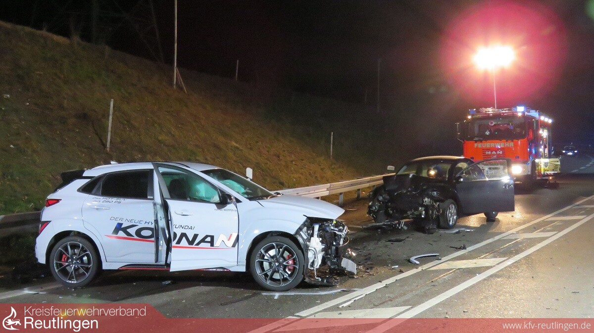 An der sogenannten Rommelsbacher Brücke an der Ausfahrt Metzingen-West kam ein 20-Jähriger Fahrzeuglenker mit seinem Hyundai, vermutlich aufgrund nicht angepasster Geschwindigkeit, in einer langgezogenen Rechtskurve mit seinem Wagen zunächst komplett auf die Gegenfahrbahn. Anschließend kam das Fahrzeug wieder nach rechts auf die eigene Fahrspur bevor es sich unkontrolliert mehrmals um die eigene Achse drehte, in die rechte Leitplanke einschlug und anschließend quer über die Fahrbahn geschleudert wurde. Infolgedessen kam es zum Zusammenstoß mit einem VW-Beetle einer 24-jährigen Fahrerin.