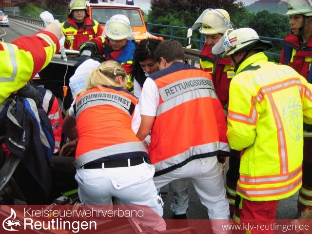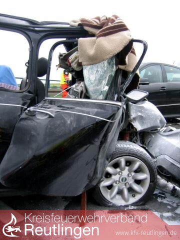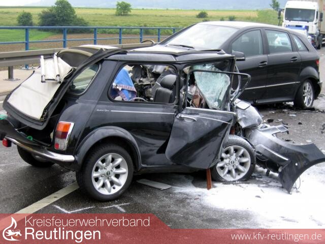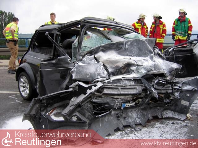 Lebensgefährliche Verletzungen erlitt eine 38-jährige Frau bei einem Frontalzusammenstoß am Montagmorgen auf der B 28 zwischen Neuhausen und der Anschlussstelle Metzingen Ost auf der Tiefenbachbrücke. Eine 24-jährige Frau, die mit ihrem Mercedes der B-Klasse kurz vor 7 Uhr auf der Bundesstraße von Bad Urach in Richtung Metzingen unterwegs war, geriet aus noch ungeklärter Ursache nach links auf die Gegenfahrbahn und stieß dort nahezu frontal mit einem entgegen kommenden Mini zusammen. Der Aufprall war so heftig, dass die 38-jährige Minifahrerin in ihrem total demolierten Wagen eingeklemmt wurde. Sie musste von der Feuerwehr aus dem Fahrzeug herausgeschnitten werden. Dazu mussten Spreizer, Schneidgerät und Hydrostempel eingesetzt werden. Danach kam die verletzte Frau in eine Klinik. Die 24-jährige Mercedesfahrerin erlitt einen Schock und leichte bis mittelschwere Verletzungen. Sie wurde ebenfalls in ein Krankenhaus gebracht. An den beiden verunglückten Autos entstand jeweils wirtschaftlicher Totalschaden. Zur Feststellung des genauen Unfallhergangs wurde ein Sachverständiger hinzugezogen. Die B 28 war nach dem Unfall für die Dauer von etwa viereinhalb Stunden voll gesperrt. Der Verkehr wurde während dieser Zeit örtlich umgeleitet und die Umleitungsstrecke entsprechend ausgeschildert. Trotzdem kam es zu erheblichen Verkehrsbehinderungen. Die Feuerwehr kam nach der Personenrettung noch bei den anschließenden Bergungsarbeiten zum Einsatz.