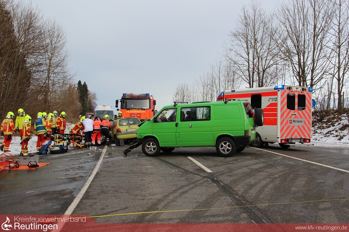 Die Feuerwehr Metzingen wurde am frühen Mittwochnachmittag zu einem Verkehrsunfall auf die L 378a zwischen Metzingen und Reutlingen gerufen. Aus bislang ungeklärter Ursache prallten ein VW-Kleinbus und ein Renault Twingo nahezu frontal zusammen. Dabei wurde eine Person in ihrem PKW eingeklemmt und musste mittels hydraulisch Rettungsgerät von der Feuerwehr befreit werden. Die schwerletzte Person wurde anschließend mit dem Rettungsdienst in eine Klinik eingeliefert. Beide Fahrzeuge mussten durch Abschleppunternehmen geborgen werden. Die Landstraße musste für die Dauer der Unfallaufnahme bis ca. 16:30 Uhr voll gesperrt werden. Im Einsatz waren die Feuerwehr Metzingen, Abteilung Stadtmitte, mit fünf Fahrzeugen und 18 Einsatzkräften, der Rettungsdienst mit zwei Rettungswagen und einem Notarzt sowie die Polizei mit mehreren Streifenwagen.