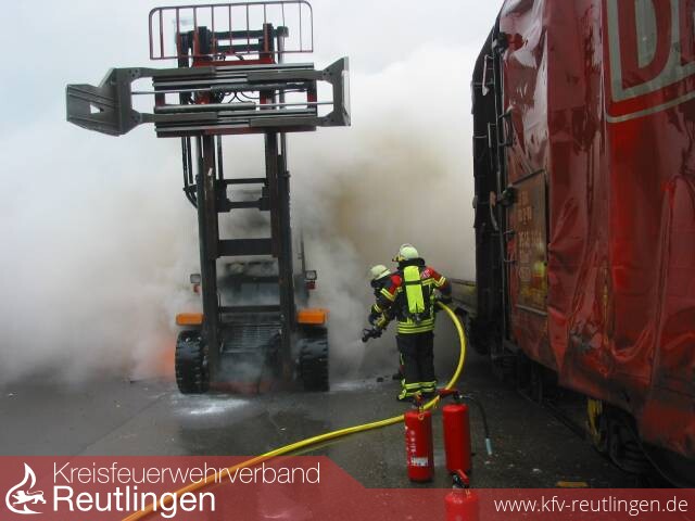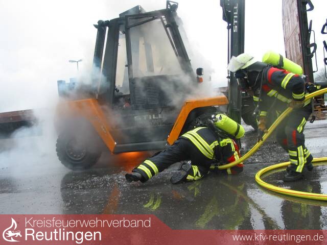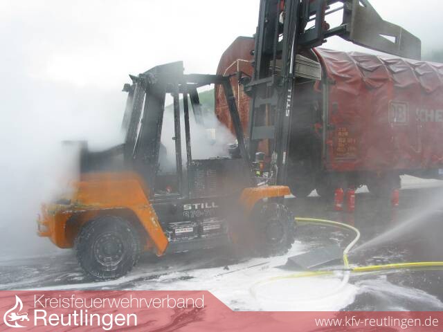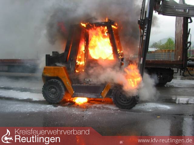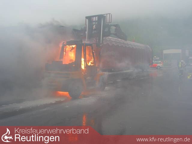 Am Dienstagmorgen ist gegen 07.35 in einem Dettinger Betrieb ein Gabelstapler in Brand geraten. Ein 54 Jahre alter Maschinenführer war gerade dabei, ein Zugwaggon zu entladen. Während des Rangierens schlugen plötzlich Rauch und Flammen aus dem Heck des dieselbetriebenen Gabelstaplers. Der relativ neuwertige Gabelstapler geriet in Vollbrand und konnte erst durch die Feuerwehr abgelöscht werden. Verletzt wurde zum Glück niemand. Der Stapler wurde durch den Brand völlig zerstört. Der entstandene Schaden ist mit 70.000 Euro beträchtlich. Ursache war vermutlich ein technischer Defekt. (PP Reutlingen)
