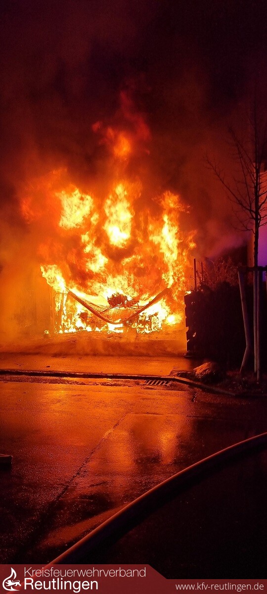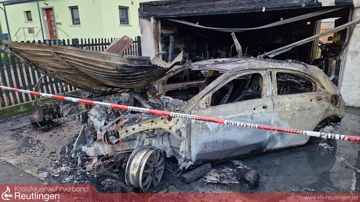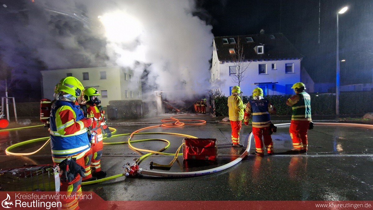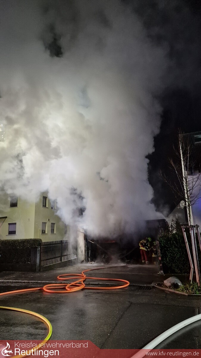 Zu einem Garagenbrand ist die Feuerwehr Metzingen am frühen Montag gegen 3 Uhr gerufen worden. Bewohner wurden durch explosionsartige Geräusche aus dem Schlaf gerissen und fanden eine in Vollbrand stehende Garage vor.
