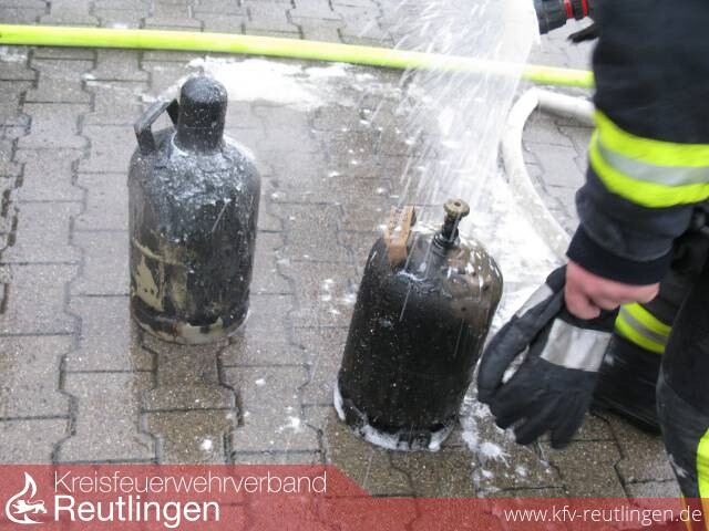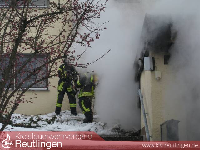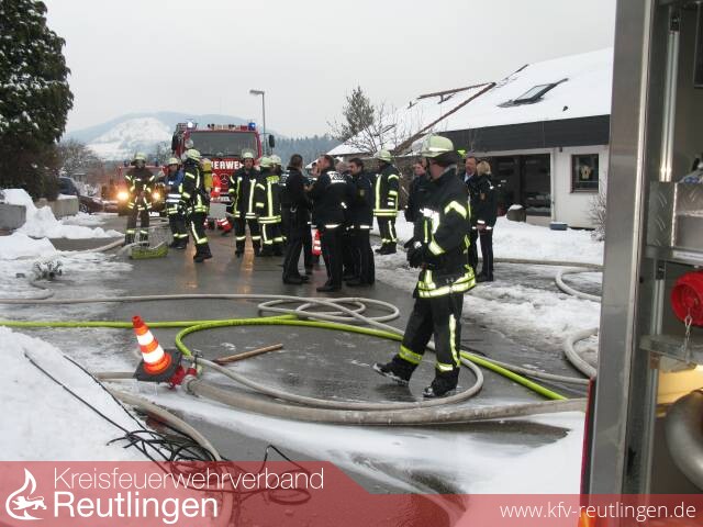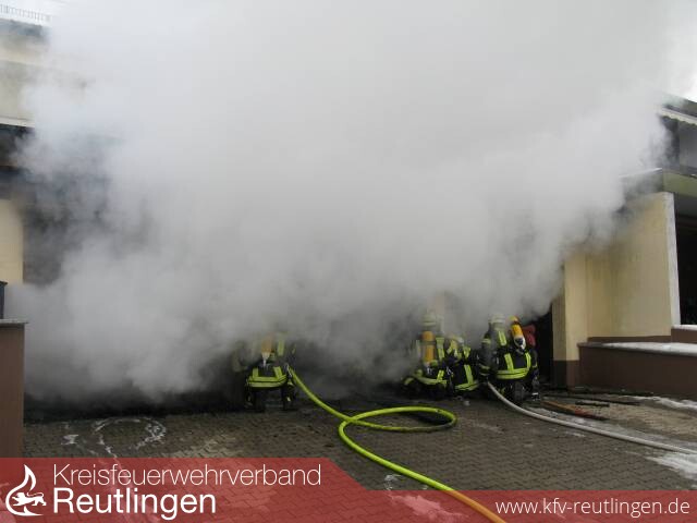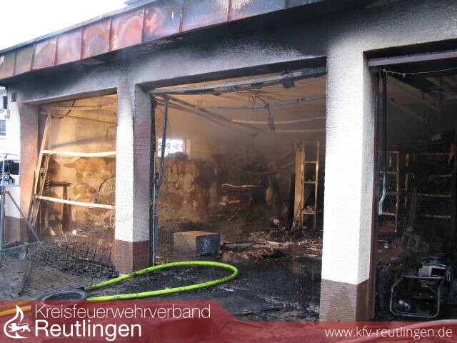 Zum Brand einer 3-fach-Garage in der Panoramastraße wurden wir am vergangenen Montag, dem 21. Januar 2013 um 15.20 Uhr gerufen. Bereits auf der Anfahrt zum Gerätehaus war für einige Kameraden eine kilometerweit sichtbare Rauchsäule zu sehen, die den Weg zum Einsatzort zeigte. Beim Eintreffen unseres 1. Fahrzeuges stand die freistehende 3-fach-Garage bereits im Vollbrand. Mit insgesamt vier Trupps unter Atemschutz und 3 C-Rohren gelang es relativ schnell den Brand unter Kontrolle zu bringen und ein Übergreifen auf das daneben stehende Wohnhaus und die direkt angebaute Nachbargarage zu verhindern. Glücklicherweise entstand am Wohnhaus durch unsere sofortiges Eingreifen kein weiterer Schaden. Ein Anwohner musste mit leichten Verletzungen in ein Krankenhaus eingeliefert werden. Der gesamte Inhalt der drei Garagen dürfte aber bis auf den PKW, den die Besitzer gerade noch mit wenigen Schäden aus der Garage fahren konnten, nahezu Totalschaden sein. Zur Brandursache nahm die Polizei Ihre Ermittlungen auf, ein Ergebnis liegt derzeit leider noch nicht vor. Die Feuerwehr Grafenberg war mit allen 3 Fahrzeugen und 20 Kräften ebenso im Einsatz wie die Polizei Metzingen mit 4 Streifenwagen sowie das Deutsche Rote Kreuz mit einem Rettungswagen und der DRK-Bereitschaft aus Metzingen
