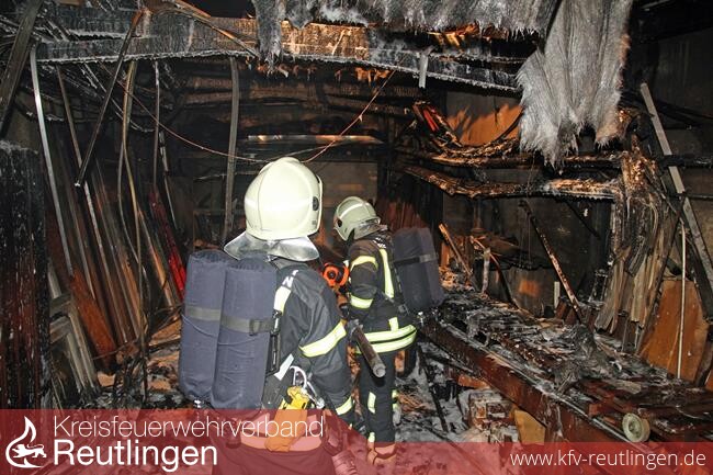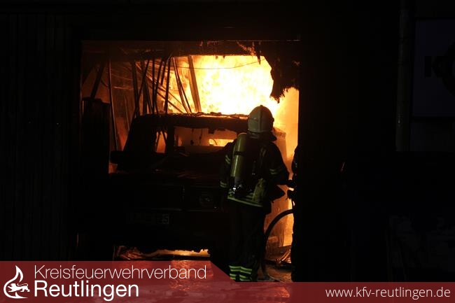 Gegen 00.00 Uhr war der Brand unter Kontrolle. Die Nachlöscharbeiten dauerten bis 01.45 Uhr an. Der ausgebrannte PKW musste mit einem Stapler aus der Garage herausgezogen werden, um auch die letzten Brandnester ablöschen zu können.