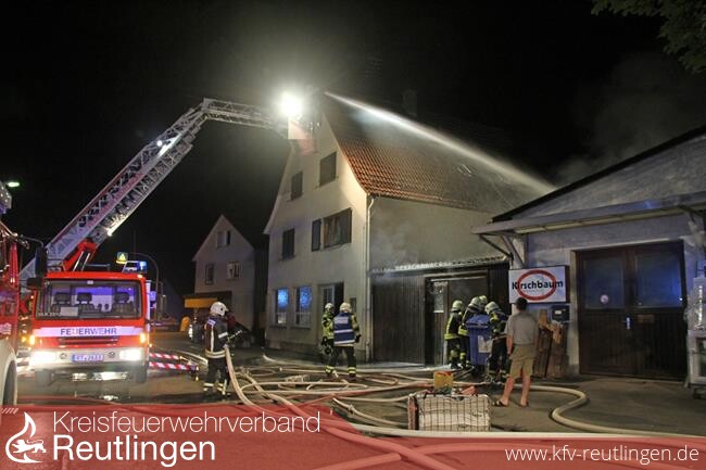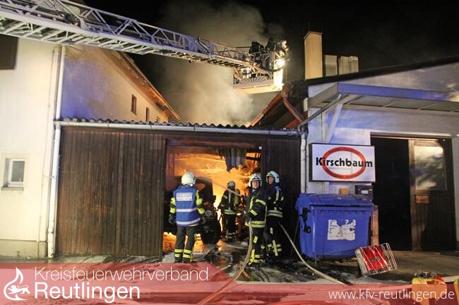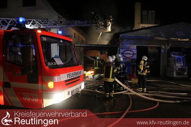 Beim Eintreffen der ersten Einsatzkräfte schlugen bereits Flammen aus einer Garage, die zwischen einer Fensterbaufirma und einem Wohnhaus angebaut war. Der Brand drohte auf der einen Seite auf das angebaute Wohnhaus und auf der anderen Seite auf den Schreinereikomplex der Firma überzugreifen. Die Bewohner des Wohnhauses hatten bereits das verrauchte Gebäude verlassen.