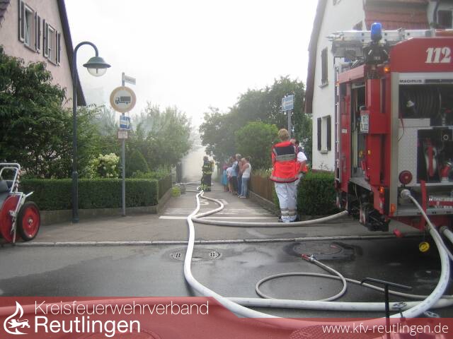 Beim Eintreffen der Feuerwehr stand das Dachgeschoss einer Doppelgarage (Massivbauweise / 10x8 mtr.) in der Walddorfer Strasse im Ortsteil Gniebel in Pliezhausen bereits in Vollbrand. Die Flammen schlugen ca. 6 Meter übers Garagendach und bedrohten das in 3 Meter entfernt stehende Wohnhaus.