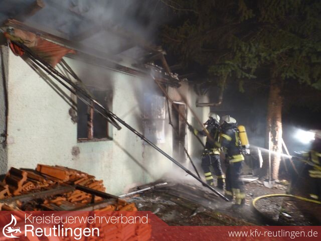 Zum Ablöschen der restlichen Glutnester musste das einsturzgefährdete Dach heruntergenommen sowie das Inventar aus der Gartenhütte entfernt und abgelöscht werden. Während diesen langwierigen Nachlöscharbeiten waren mehrere Trupps unter Atemschutz im Einsatz.
