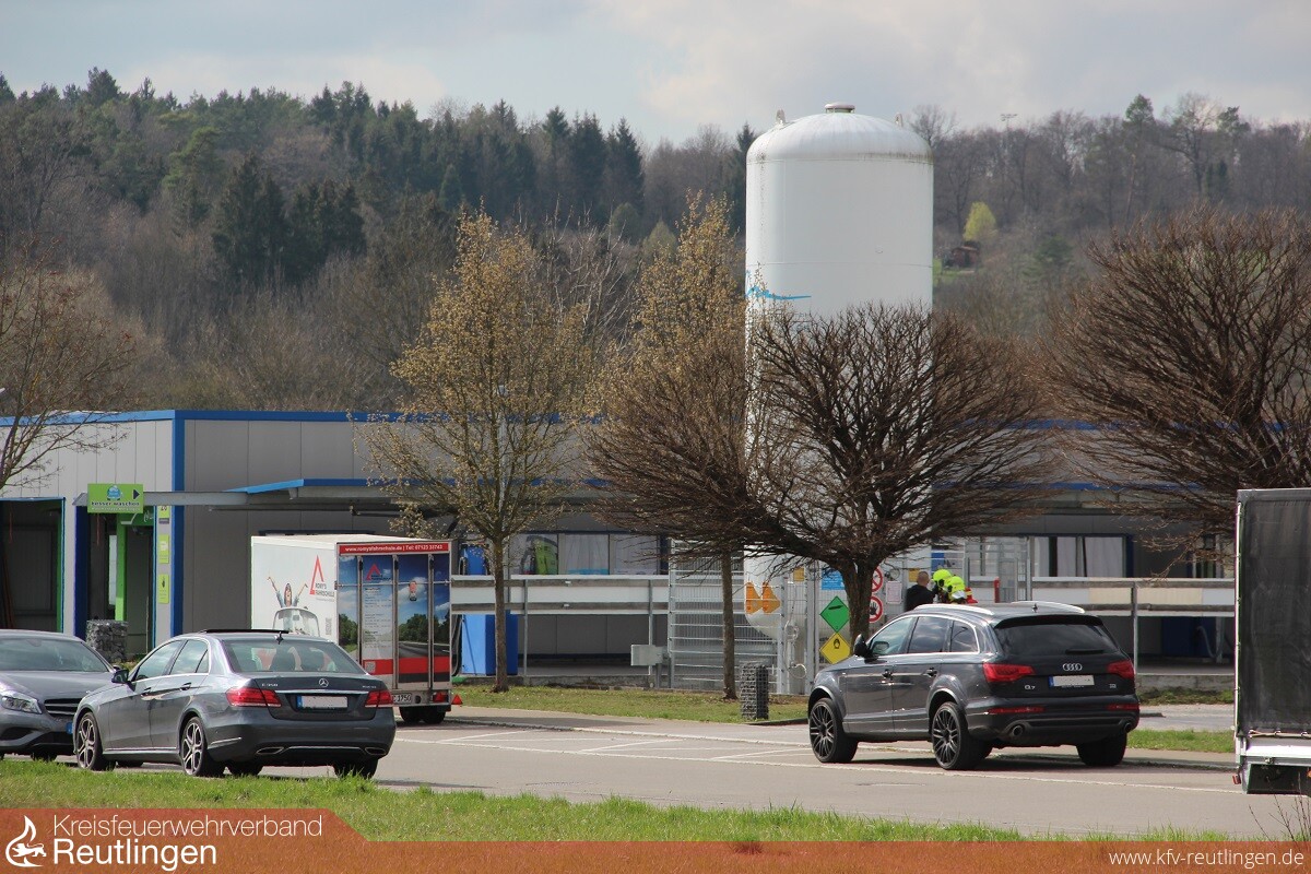 Zu einem Gasaustritt wurde der Gefahrstoffzug Ermstal, bestehend aus den Feuerwehren Metzingen und Dettingen/Erms, in ein Metzinger Industriegebiet alarmiert. Die Einsatzstelle wurde weiträumig abgesperrt und ein Trupp unter Atemschutz zur Erkundung an einen außenstehenden Gastank beordert.