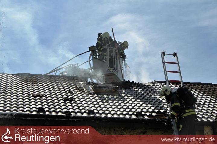 Die Feuerwehr trug sofort einen mehrseitigen Löschangriff vor. Über die Drehleiter wurden das Dach und der obere Teil des Giebels abgelöscht, durch ein weiteres handgeführtes Rohr konnten die Anbauten sowie das Gemüsegewächshaus schnell gelöscht werden. Aufgrund der raschen Brandausbreitung hatte sich das Feuer bereits auf die Dachkonstruktion ausgebreitet. Das Feuer war zwischen Dachziegel und Raumabschluss im Spitzboden bereits eingedrungen. Durch einen weiteren Trupp unter Atemschutz wurde das Dach von innen geöffnet und von der Drehleiter wurde von außen unterstützt. Dadurch konnte ein schneller Löscherfolg erzielt werden.
