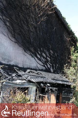 Das Feuer war an der Giebelseite im Außenbereich schon sehr weit fortgeschritten. Ein Anbau aus Holz, Teile eines Gemüsegewächshauses und die Rankpflanze am Giebel standen im Vollbrand. Die Flammen schlugen 1-2 Meter über den Giebel. Der Bewohner und ein Nachbar standen bei Eintreffen der Feuerwehr außerhalb und hatten schwarz verrußte Hände und Gesichter. Der Bewohner versuchte selbst noch Löschversuche durchzuführen. Ein Nachbar zog den Bewohner weg, da die Flammen zu groß wurden. Beide atmeten dabei etwas Rauchgase ein und wurden leicht verletzt. Daher mussten beide vom Rettungsdienst behandelt werden. Der Bewohner konnte jedoch noch während der Löscharbeiten das Krankenhaus wieder verlassen.