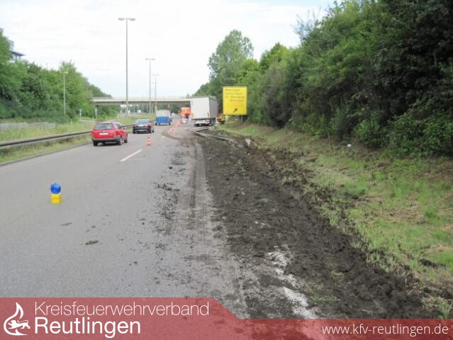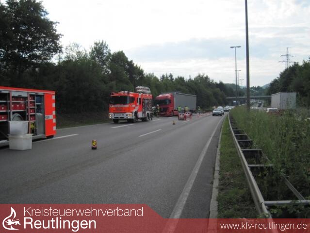 Am 25.07.2011 um 08.28 Uhr wurde der Integrierten Leitstelle Reutlingen ein umgestürzter Sattelzug auf der B 28 Fahrtrichtung Tübingen beim Knoten Betzingen gemeldet. Die Meldung beinhaltete, dass an dem Lkw Dieselkraftstoff auslaufen würde. Über die Art der Beladung konnte keine Aussage gemacht werden.