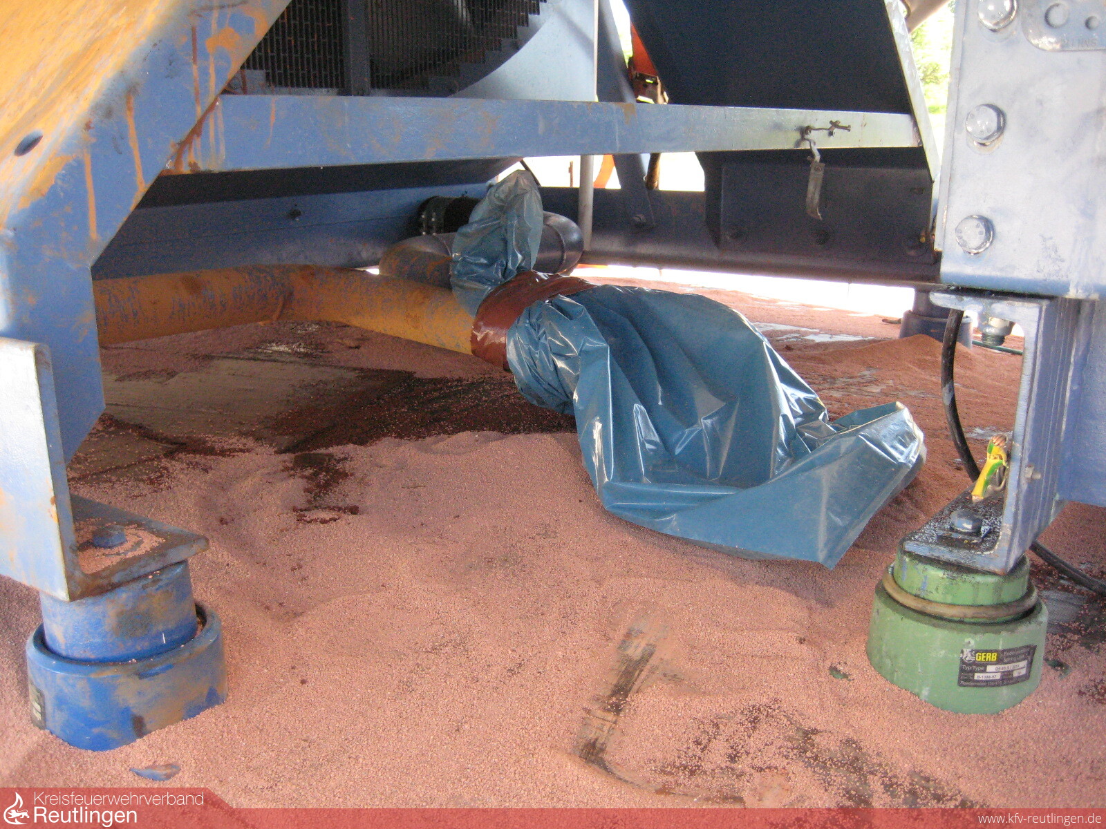 Als die Polizisten die Ladung kontrollieren wollten, tropfte ihnen bereits das Hydrauliköl entgegen. Von der verständigten Feuerwehr wurde zuerst mit Dichtmaterial unterbunden, dass weiteres Öl auf die Ladefläche, beziehungsweise die Straße floss. Mit einer größeren Menge an Ölbindemittel ist im Anschluss das ausgetretene Medium gebunden und aufgenommen worden. Bis zur ordnungsgemäßen Sicherung der Ladung untersagte die Polizei die Weiterfahrt des Lastzuges.