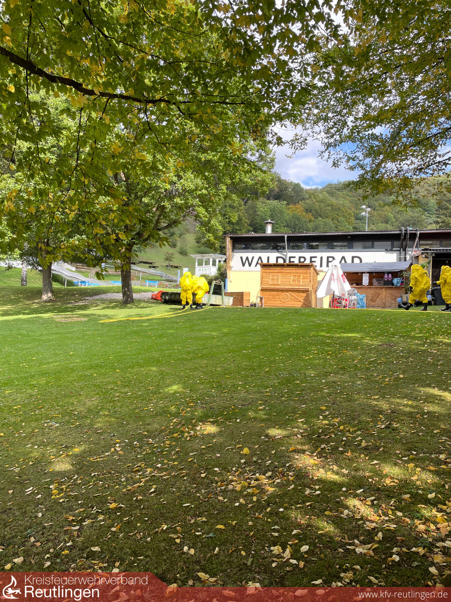 Um 13:11 Uhr wurde ein Großaufgebot an Rettungskräften von Feuerwehr, Rettungsdienst und Polizei zu einem Chlorgasaustritt ins Eninger Waldfreibad im Obtal alarmiert. Den ersteintreffenden Einsatzkräften bot sich folgendes Lagebild: Beim Wechsel einer Chlorgasflasche wurde durch Mitarbeiter ein technischer Defekt an einer Flasche festgestellt. Umgehend brachten sich alle Mitarbeiter in Sicherheit und verständigten die Feuerwehr. Der Badebetrieb war zum gegenwärtigen Zeitpunkt bereits witterungsbedingt eingestellt. Ein aktiver Austritt von Chlorgas war in der Anfangsphase nicht festzustellen.