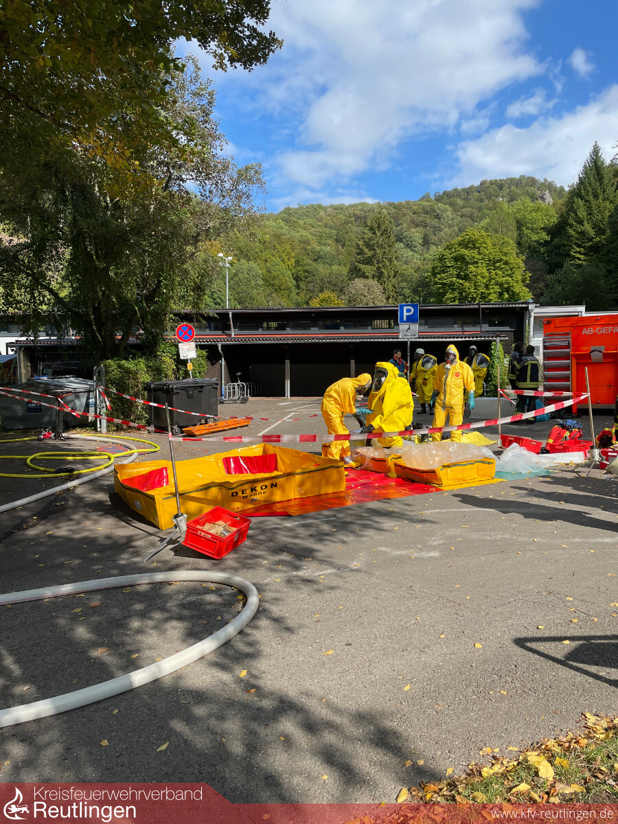 Der Gefahrstoffzug, welcher sich aus den Feuerwehren Reutlingen und Pfullingen zusammensetzt, begann im weiteren Verlauf des Einsatzes mit dem Aufbau eines Dekontaminationsplatzes und den Vorbereitungsmaßnahmen für den Einsatz im Gefahrenbereich. Anschließend gingen zwei Trupps unter Chemikalienschutzanzug zur betroffenen Chlorgasflasche vor. Die Spezialkräfte konnten die Flasche sichern, wobei eine geringe Restmenge Chlorgas austrat, welche sich noch im Leitungssystem befand. Dieser Austritt wurde mittels Wasser entsprechend niedergeschlagen und neutralisiert. Anschließend wurden die betroffene Chlorgasflasche sowie das restliche System kontrolliert und entsprechend gesichert. Somit bestand anschließend keine Gefahr mehr eines Stoffaustritts. Während des gesamten Einsatzes standen zwei Fachberater Chemie des Gefahrstoffzuges der Einsatzleitung beratend zur Seite. Verletzte Personen waren nicht zu verzeichnen.
