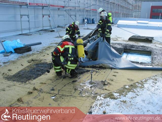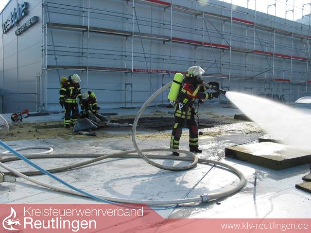 Bei Dacharbeiten kam es auf einem Flachdach zu einem offenen Feuer, welches auf die Dachisolierung übergriff. Mit einem Löschrohr konnte das Feuer rasch abgelöscht werden. Anschließend wurde die Dachhaut noch ein mit einem Trennschleifer geöffnet um weitere Brandstellen auszuschließen.