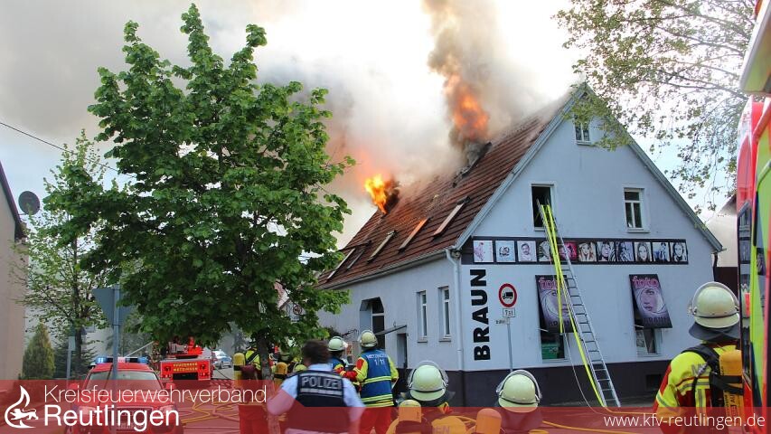Gegen 5.45 Uhr erreichten die ersten Einsatzkräfte den Brandort in der Brühlstraße. Aus der gesamten Dachfläche eines unbewohnten Geschäftshauses drang zu diesem Zeitpunkt Rauch ins Freie. Nachdem die Feuerwehrleute im Obergeschoss ein Fenster eingeschlagen hatten, rückte ein erster Trupp über eine Leiter ins Innere vor. Hier stellten die Wehrmänner zwar eine zunehmende Verrauchung, aber kein offenes Feuer und somit zunächst auch keinen Brandherd fest. Als bereits drei Trupps im Gebäude waren, kam es zu einer Durchzündung, nachdem mehrere Abluftöffnungen geschaffen worden waren. Für die Feuerwehrleute keine ungefährliche Situation, \"wir haben unsere Kräfte sofort aus dem Gebäude abgezogen\",wie Jürgen Späth, stellvertretender Feuerwehr-Kommandant in Metzingen, berichtet.