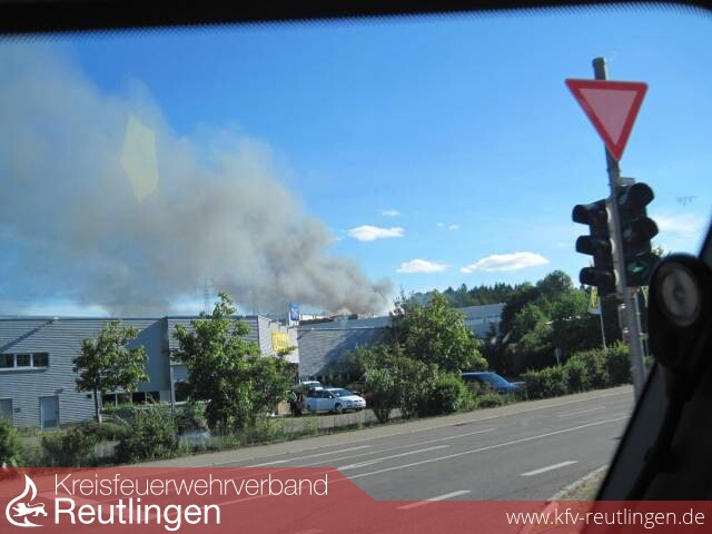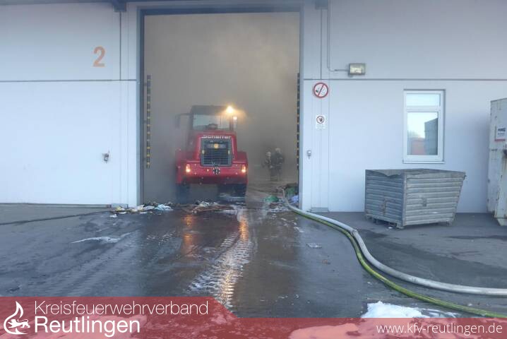 Beim Eintreffen des Löschzuges der Berufsfeuerwehr wurde festgestellt, dass in der Halle der Firma Renz, Täleswiesenstraße, größere Mengen von Altpapier in Brand geraten waren. Die Halle stand kurz vor der Durchzündung Zwei Beschäftigte der Firma Renz, die noch Löschversuche unternommen hatten, wurden vom Rettungsdienst mit Verdacht auf Rauchgasvergiftung ins Klinikum am Steinenberg nach Reutlingen gebracht.