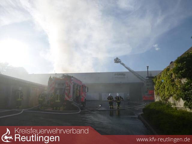 Der Einsatzleiter lies die Alarmstufe umgehend auf Brand 5 erhöhen und drei weitere Löschzüge aus Reutlingen und Kusterdingen nachrücken. Die Brandbekämpfung wurde mit 6 Löschrohren im Innenangriff aufgenommen. 2 Weitere Rohre wurden über Drehleitern in Bereitstellung gehalten. Aufgrund der starken Rauchentwicklung wurden 2 Messfahrzeuge im Industriegebiet und im angrenzenden Stadtbezirk Betzingen eingesetzt. Es konnten mit der Messtechnik der Feuerwehr keine Schadstoffe nachgewiesen werden, trotzdem wurde das Industriegebiet von der Polizei weiträumig abgesperrt. Über den das Lagezentrum des Innenministeriums wurde eine Meldung an den Warnfunk herausgegeben,