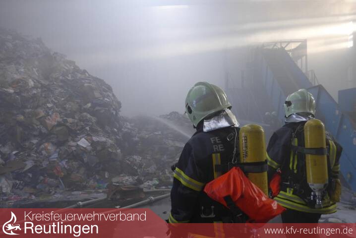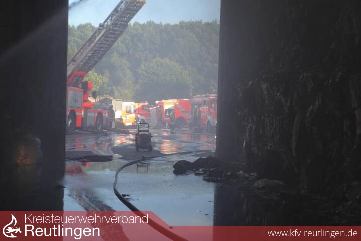 Die Feuerwehr ist insgesamt mit rund 140 Einsatzkräften vor Ort gewesen, unterstützt vom DRK Reutlingen. Das THW aus Ofterdingen unterstützt derzeit die Feuerwehr mit einem Radlader beim Ausräumen der Papierballen aus der Halle.