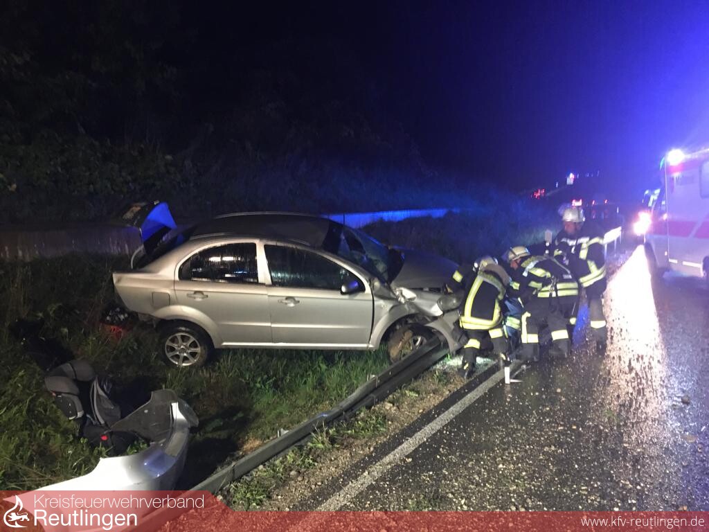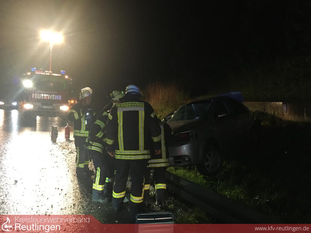 Zu einem schweren Verkehrsunfall wurde die Feuerwehr Grafenberg am Samstag, dem 17. September um 20.33 Uhr auf die Bundesstraße 313, Ortsumfahrung Grafenberg zwischen dem Kreisverkehr Süd und Nord gerufen. Der Fahrer eines PKW war aus Richtung Metzingen kommend in einer langgezogenen Linkskurve vermutlich aufgrund nicht angepasster Geschwindigkeit nach links von der Fahrbahn abgekommen und hinter der Leitplanke an der Böschung zum Stehen gekommen. Beim Eintreffen der Feuerwehr konnte schnell festgestellt werden, dass der Fahrer, der allein im Fahrzeug war, bereits selbständig seinen PKW verlassen hatte und sich in Behandlung des Rettungsdienstes befand. Der Einsatz der Feuerwehr beschränkte sich glücklicherweise auf das Absichern der Unfallstelle, Sicherstellung des Brandschutzes und reinigen der Fahrbahn. Weiter war man dem Abschleppdienst beim Abtransport des nicht mehr fahrbereiten Fahrzeuges behilflich. Die Feuerwehr Grafenberg war mit einem Fahrzeug und elf Kräften, vier weitere standen noch in Bereitschaft, ebenso im Einsatz wie zwei „Helfer vor Ort“, ein Rettungswagen und die Polizei.