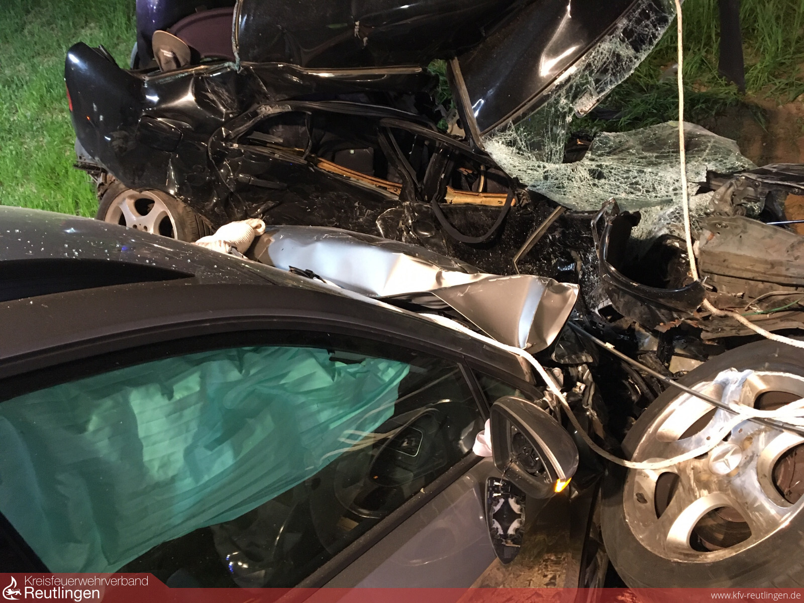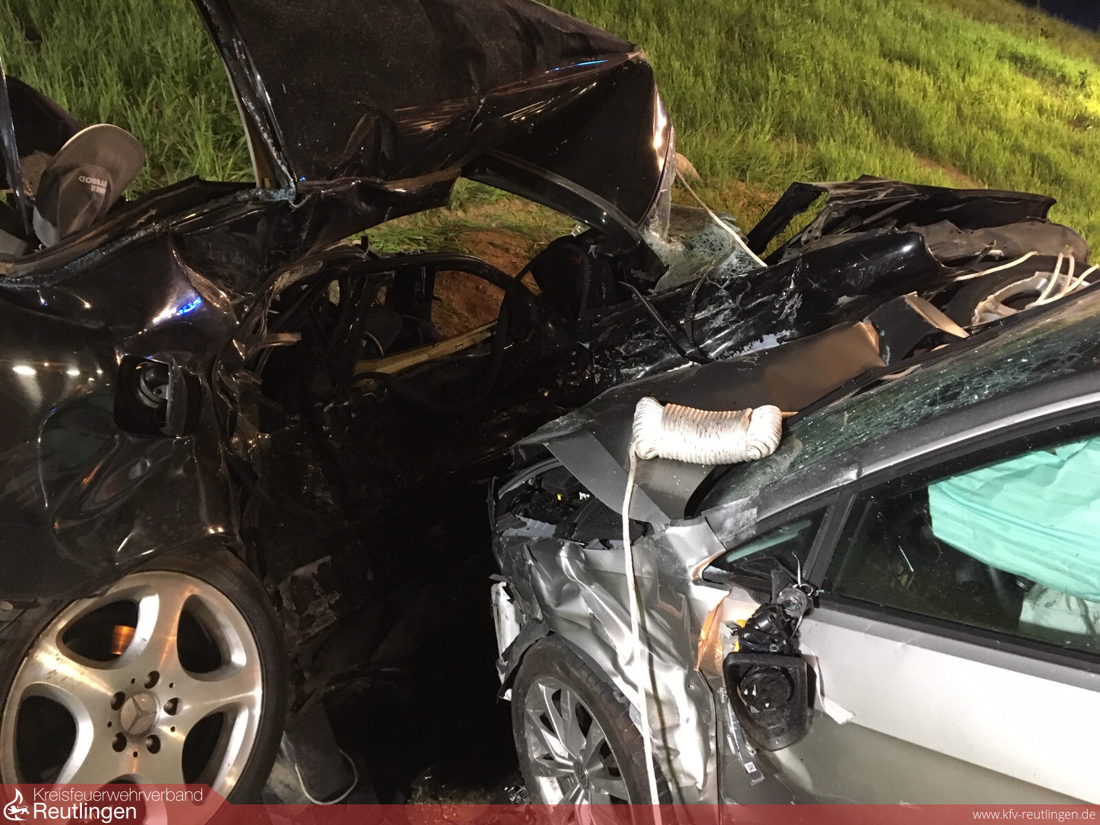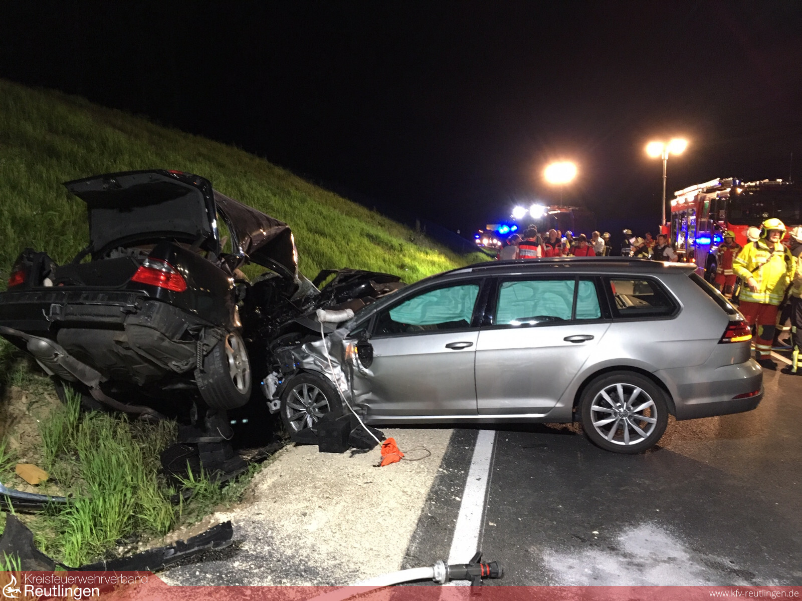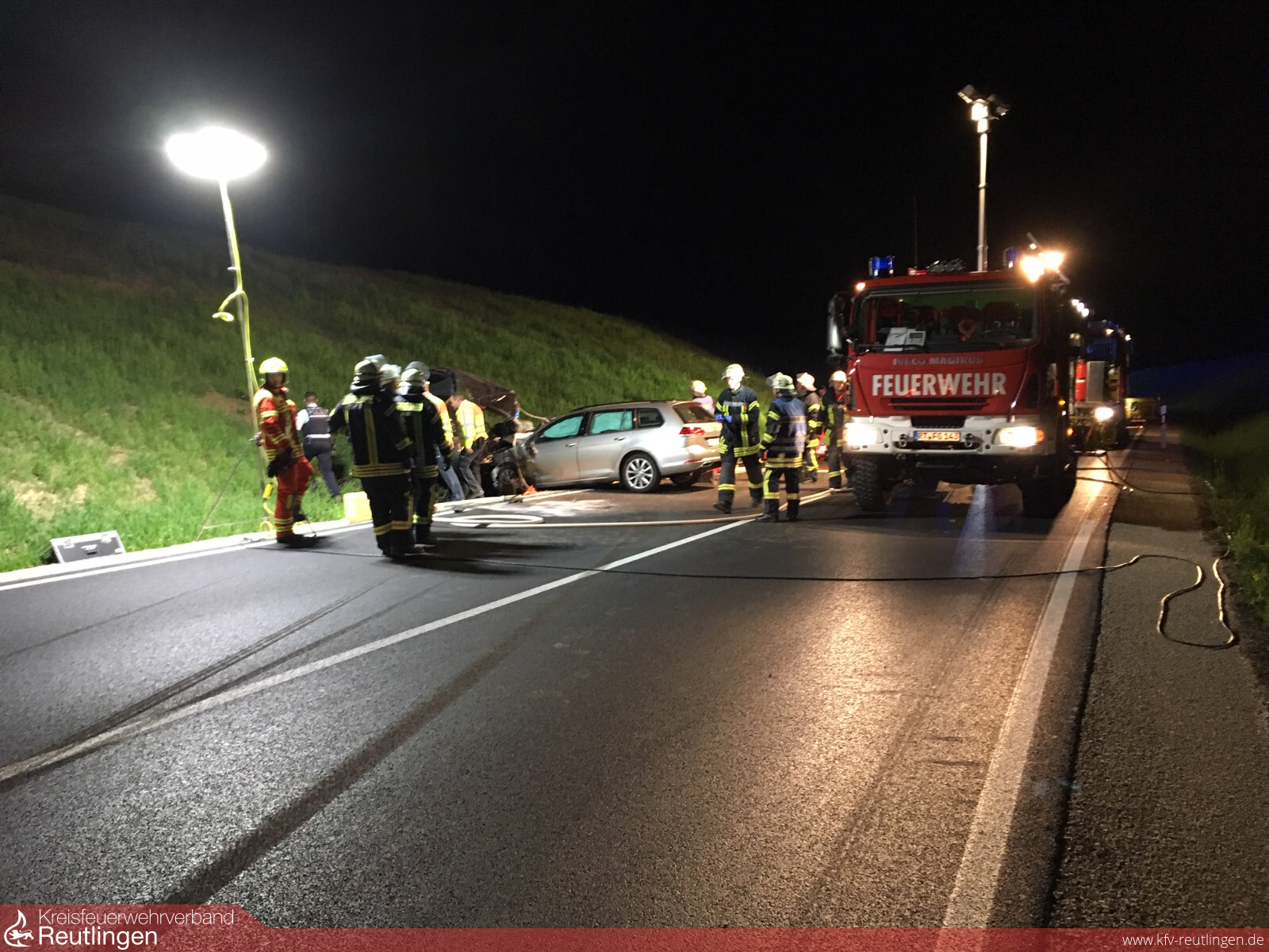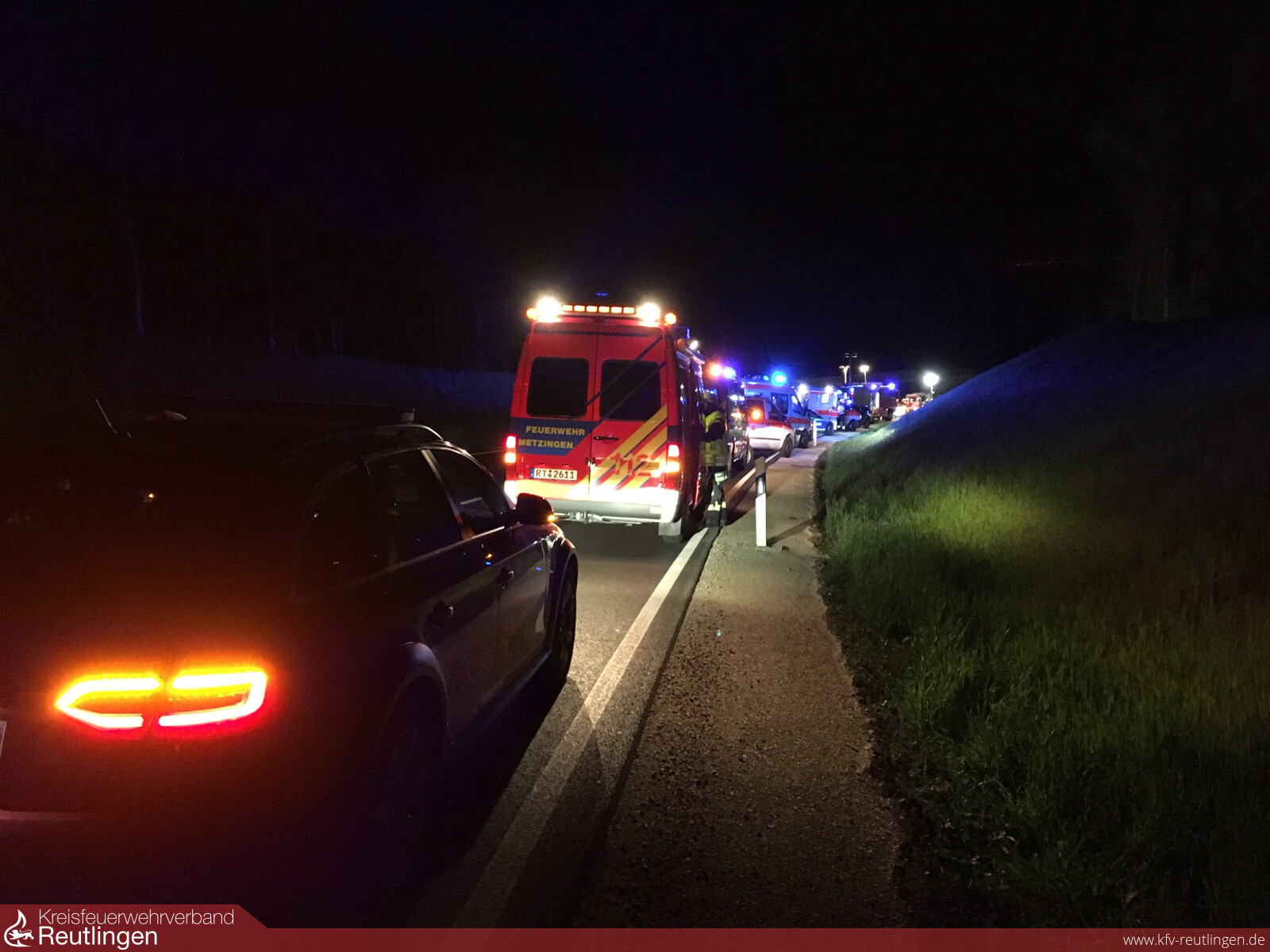 Bereits der zweite schwere Verkehrsunfall, diesmal leider mit tödlichem Ausgang, auf der Ende April eröffneten Ortsumfahrung B313 ereignete sich am Sonntag, dem 02. Juni. Um 23.18 Uhr wurden die Freiwilligen Feuerwehren aus Grafenberg und Metzingen zur Unfallstelle gerufen. Ein junger Mercedes Lenker befuhr die Umgehungsstraße aus Richtung Nürtingen kommen. In der letzten Rechtskurve kam er vermutlich aufgrund überhöhter Geschwindigkeit ins schleudern und prallte mit der rechten Fahrzeugseite gegen einen ordnungsgemäß aus Richtung Metzingen kommenden VW-Golf Fahrer. Der Golffahrer hatte den Mercedes auf sich zukommen sehen und noch abgebremst, konnte aber den erheblichen Seitenaufprall letztlich nicht verhindern. Beim Eintreffen des ersten Fahrzeuges aus Grafenberg war sofort klar, dass der Fahrer des Mercedes in seinem Fahrzeug eingeklemmt war. Mit der sogenannten „Crash-Rettung“ konnte die Person innerhalb weniger Minuten aus dem Fahrzeug befreit und dem Notarzt übergeben werden, der allerdings nur noch den Tod des Fahrers feststellen konnte. Der Golf-Fahrer konnte sein Fahrzeug selbständig verlassen und wurde mit schweren Verletzungen in ein Krankenhaus gebracht. Da zunächst nicht klar war wie viele Personen eingeklemmt waren wurde auch die Feuerwehr Metzingen zur Unfallstelle alarmiert, musste aber glücklicherweise diesbezüglich nicht mehr eingreifen. Im weiteren Verlauf war die Feuerwehr der Polizei noch beim ausleuchten der etwa 120 Meter langen Unfallstelle behilflich und reinigte nach dem Abtransport zusammen mit einem Mitarbeiter des Straßenbauamtes die Fahrbahn. Die Feuerwehr Grafenberg war mit allen drei Fahrzeugen und 27 Kräften, 2 davon in Bereitschaft, im Einsatz. Weiter waren die Feuerwehr Metzingen mit 3 Fahrzeugen, der Rettungsdienst mit 3 Rettungswägen, 2 Notärzten und einem organisatorischen Leiter, ein Helfer vor Ort, 2 Abschleppwagen, der Bestatter, mehrere Polizeifahrzeuge und die Straßenmeisterei am Einsatz beteiligt. Auch der Kreisbrandmeister des Landkreis Reutlingen und der stellv. Bürgermeister aus Grafenberg verschafften sich vor Ort ein Bild der Lage. Die Bundesstraße war für die Dauer der Bergungsarbeiten fast 4 Stunden lang voll gesperrt. Damit hat die neue Ortsumfahrung bereits nach wenigen Wochen leider ihr erstes Todesopfer zu verzeichnen.