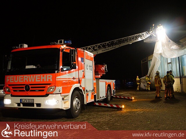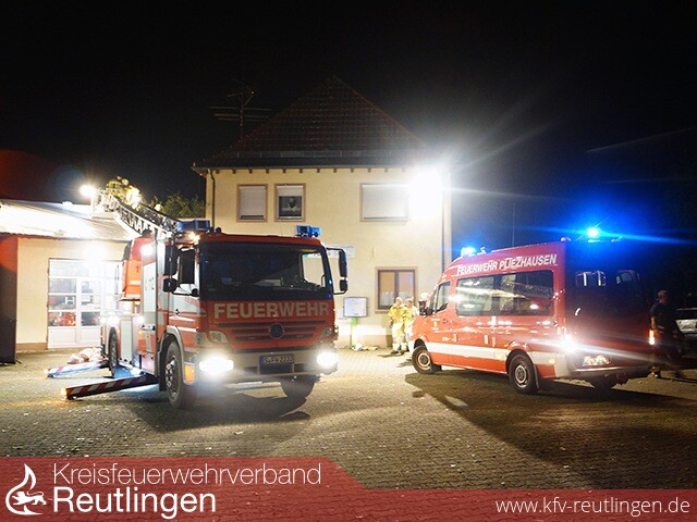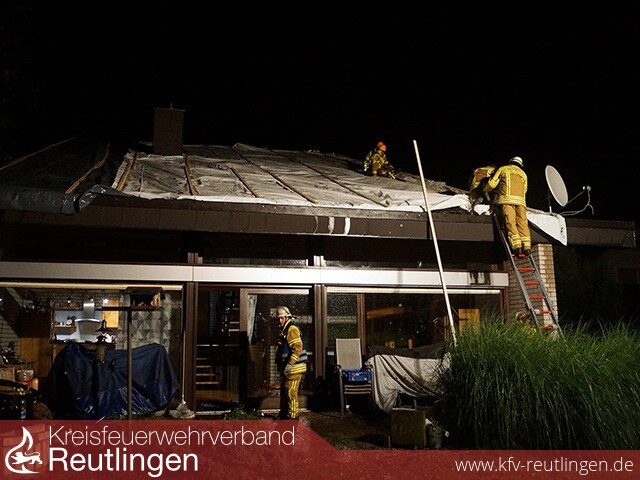 Insbesondere in unserer Nachbargemeinde Pliezhausen hinterließ das Unwetter eine Spur der Verwüstung. Aufgrund der vielen Notrufe wurde die Feuerwehr Walddorfhäslach zur Überlandhilfe angefordert. Wenige Minuten nach der Alarmierung rückten zwei Löschfahrzeuge in die Nachbargemeinde aus. Schnell zeigte sich, dass weitere Einsatzkräfte erforderlich sind. Über die Integrierte Leitstelle für Rettungsdienst und Feuerwehr wurde eine Drehleiter angefordert. Da jedoch alle Fahrzeuge im Landkreis Reutlingen im Einsatz waren, wurde ein Hubrettungsfahrzeug der Berufsfeuerwehr Stuttgart alarmiert. Insgesamt musste die Feuerwehr Walddorfhäslach an vier verschiedenen Einsatzstellen Hilfe leisten. Hierbei handelte es sich jeweils um stark beschädigte Dächer von Wohn- und Geschäftsgebäuden. Im Feuerwehrhaus Walddorfhäslach wurde zudem ein Hilfeleistungslöschfahrzeug besetzt, um bei zusätzlich anfallenden Einsätzen sofort handeln zu können. Bis in die frühen Morgenstunden waren über 30 Feuerwehrleute aus unserer Gemeinde im Einsatz.
