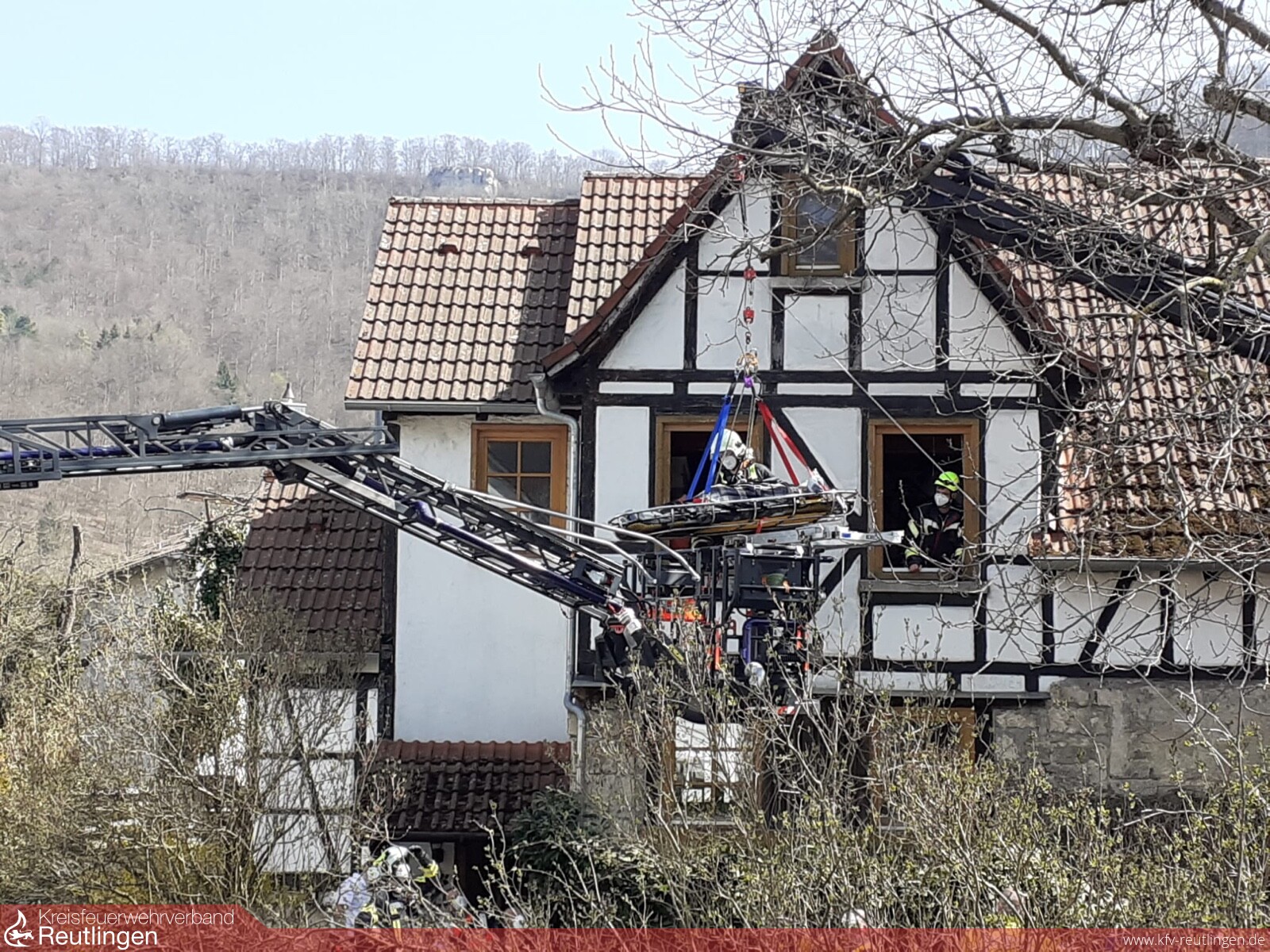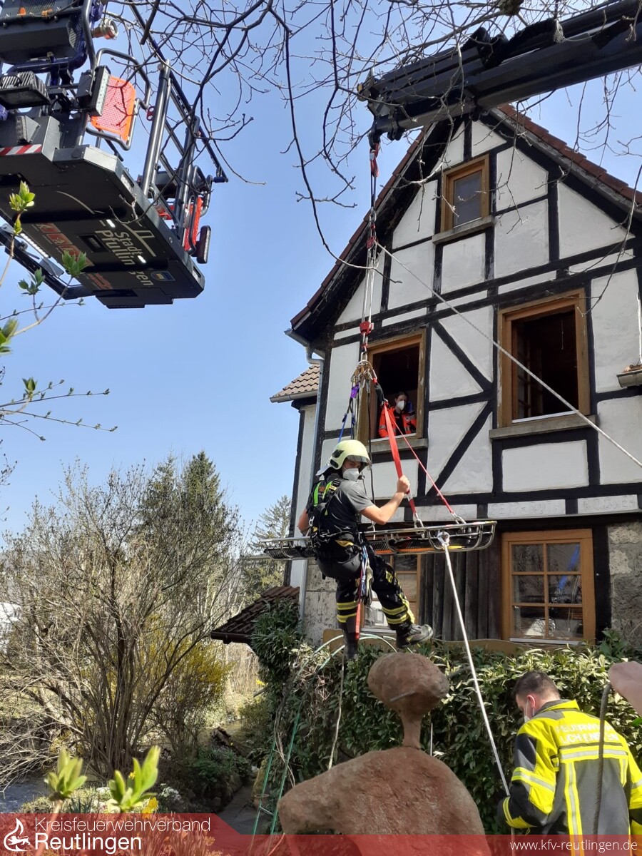 Aufgrund der beengten Verhältnisse war die Rettung nur über ein Fenster im 1 OG möglich. Da die örtlichen Verhältnisse einen direkten Einsatz der nachgeforderten Drehleiter ebenso unmöglich machte, musste die Person mit dem GWT/Kran der Feuerwehr Lichtenstein aus dem Fenster gehoben werden, um sie anschließend auf dem Drehleiterkorb absetzen und dem Rettungsdienst übergeben zu können.