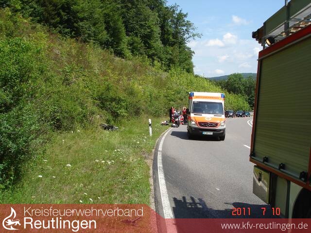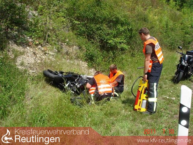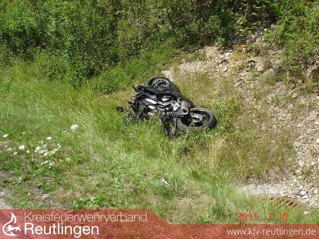 Aufgrund eines Fahrfehlers stürzte eine Motorradfahrer in der Zwiefalter Steige (B312). Der Motorradfahrer war mit 8 weiteren Bikern in Richtung Zwiefalten unterwegs als er in einer Linkskurve auf den rechten Fahrbahnrand kam. In der Folge stürzte er mit seiner Maschine, diese prallte führerlos gegen die Leitplanke, von dort zurück auf die Straße und hier gegen ein weiteres Motorrad, dabei wurde die Mitfahrerin von der Maschine geschleudert und schwer verletzt. Das Motorrad schlitterte weiter über die gesamte Fahrbahn und blieb gegenüberliegenden Straßengraben liegen. Der Fahrer wurde dabei leicht verletzt. Der zweite Motorradfahrer konnten sein Krad noch zum stehen bringen ohne die Kontrolle zu verlieren.