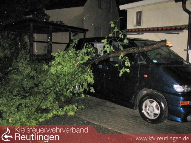 Die wohl spektakulärsten Einsatzstelle fand die Feuerwehr in der Riedstraße vor. Von einer großen Eiche wurden durch die Sturmgewalt mehrere dicke Äste abgerissen und stürzten auf ein daneben stehendes Wohnhaus und ein dort geparktes Fahrzeug. Für die Feuerwehrmänner galt es die Baumteile vom Dach des Wohnhauses zu entfernen, das beschädigte Dach provisorisch wieder abzudichten und die Straße wieder passierbar zu machen.