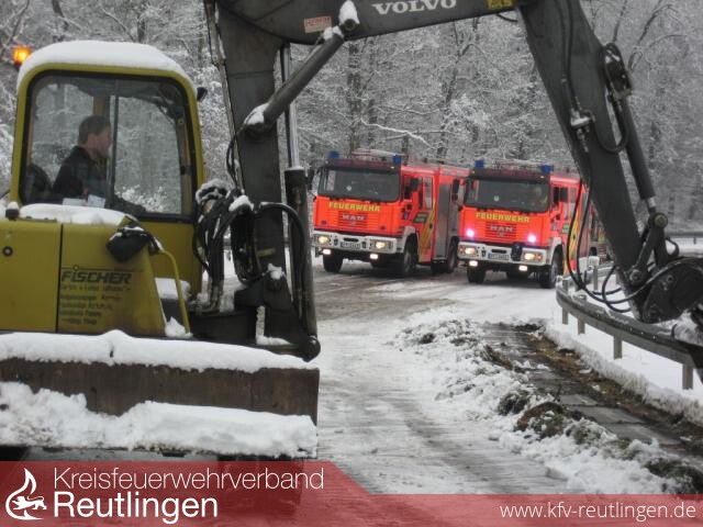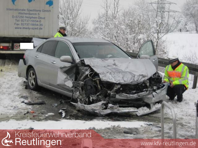 Frontal mit einem Sattelzug zusammengestoßen ist ein Autofahrer am Montagmorgen gegen 10.15 Uhr im Bereich der Metzinger Ausfahrt Längenfeld. Ein 34-Jähriger, der mit seinem Honda aus Richtung Metzingen kam und über die Zufahrt Längenfeld in die B 312 in Richtung Reutlingen einfahren wollte, rutschte in der Kurve der Ausfahrt auf der schneeglatten Straße nach links auf die Gegenfahrbahn, prallte erst gegen die Leitplanke und stieß anschließend frontal mit einem entgegen kommenden 40-Tonnen-Sattelzug eines 44-Jährigen zusammen, der auf der B 312 aus Richtung Stuttgart kam und auf die Ausfahrt in Richtung Metzingen abgebogen war. Der Honda schlitterte anschließend zwischen der Leitplanke und dem Sattelzug hindurch, wobei der 800 Liter fassende Tank des schweren Fahrzeugs aufgerissen wurde und etwa 200 Liter Dieselkraftstoff ausliefen. Der Hondafahrer zog sich bei dem Unfall leichte Verletzungen zu, während der Lkw-Fahrer unversehrt blieb. Den an den beiden Fahrzeugen entstandenen Sachschaden schätzt die Polizei auf etwa 40.000 Euro. Aufgrund des ausgelaufenen Kraftstoffs kam die Feuerwehr zum Einsatz. Außerdem wurde auch das Wasserwirtschaftsamt unterrichtet. Da das verunreinigte Erdreich abgetragen werden musste und auch eine Bergung des Sattelzuges durch ein Spezialfahrzeug erforderlich war, musste die Ausfahrt Längenfeld längere Zeit voll gesperrt werden. Die B 312 selbst war hiervon aber nicht betroffen.