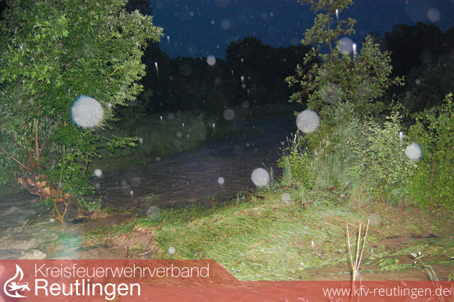 Da der Pegel von Erms und der Etwiesenbach bedrohlich anstiegt wurden an mehreren Stellen vorsorglich Sandsäcke gestapelt, die aber glücklicherweise nicht benötigt wurden.