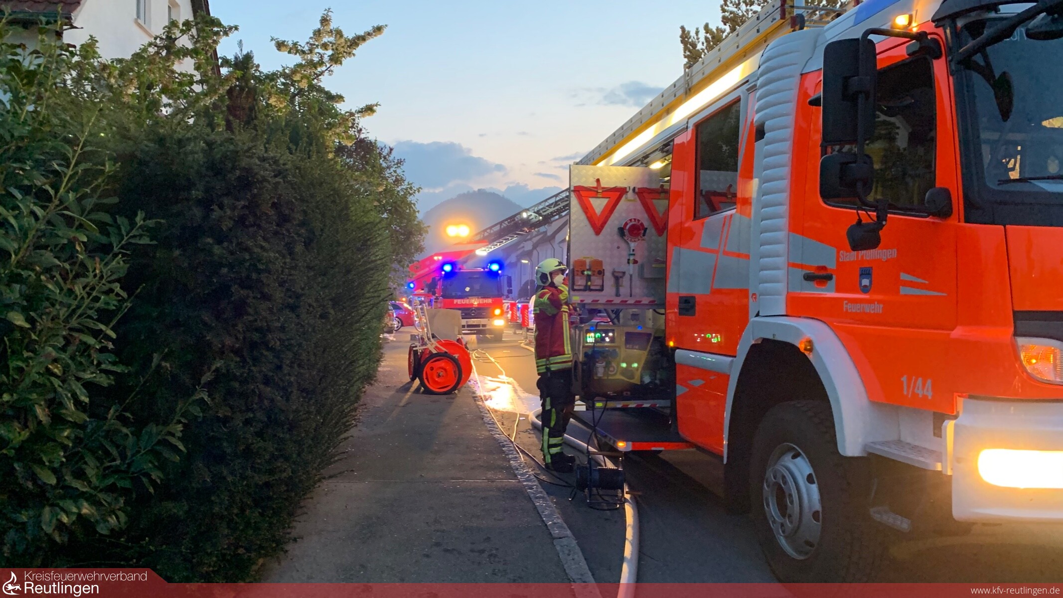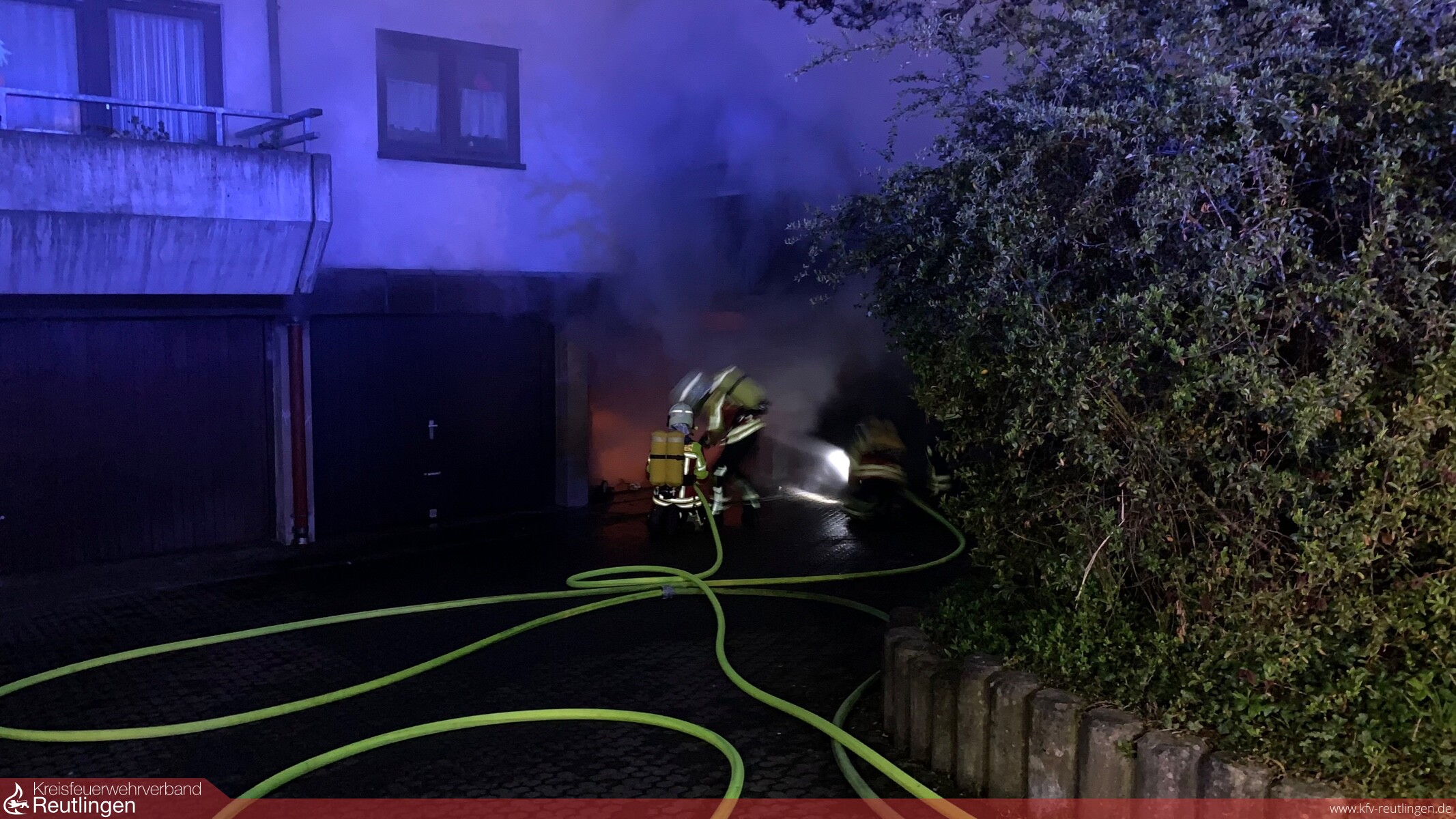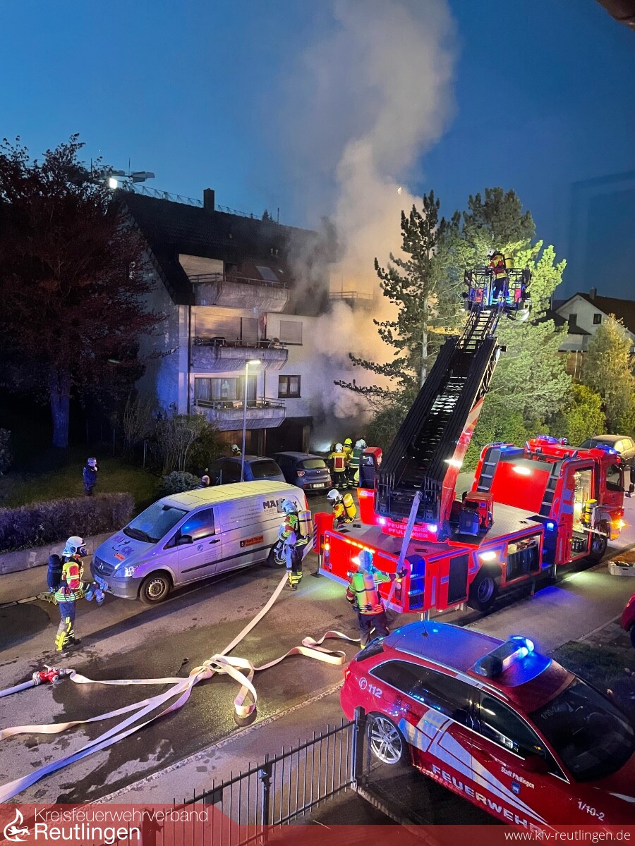 Am Montag, den 03.05.2021 um 05:14 Uhr wurde die Feuerwehr Pfullingen mit dem Alarmstichwort B3 – Kellerbrand - zu einem Mehrfamilienwohnhaus in die Hauffstraße alarmiert. Bei dem Gebäude handelt es sich um ein mehrgeschossiges Wohnhaus mit im Untergeschoss eingebauten Garagen, im Gebäude waren zum Zeitpunkt des Ereignisses 14 Personen gemeldet. Beim Eintreffen war im betroffenen Straßenabschnitt eine starke Verrauchung vorhanden, mehrere Personen erwarteten die Feuerwehr. Aus zwei Garagentoren im Untergeschoss war ein deutlicher Rauchaustritt und Feuerschein erkennbar. Nach Informationen der Anwesenden war nicht klar, ob alle Bewohner das Gebäude verlassen hätten und in einer Wohnung im Dachgeschoss befände sich noch eine Katze.