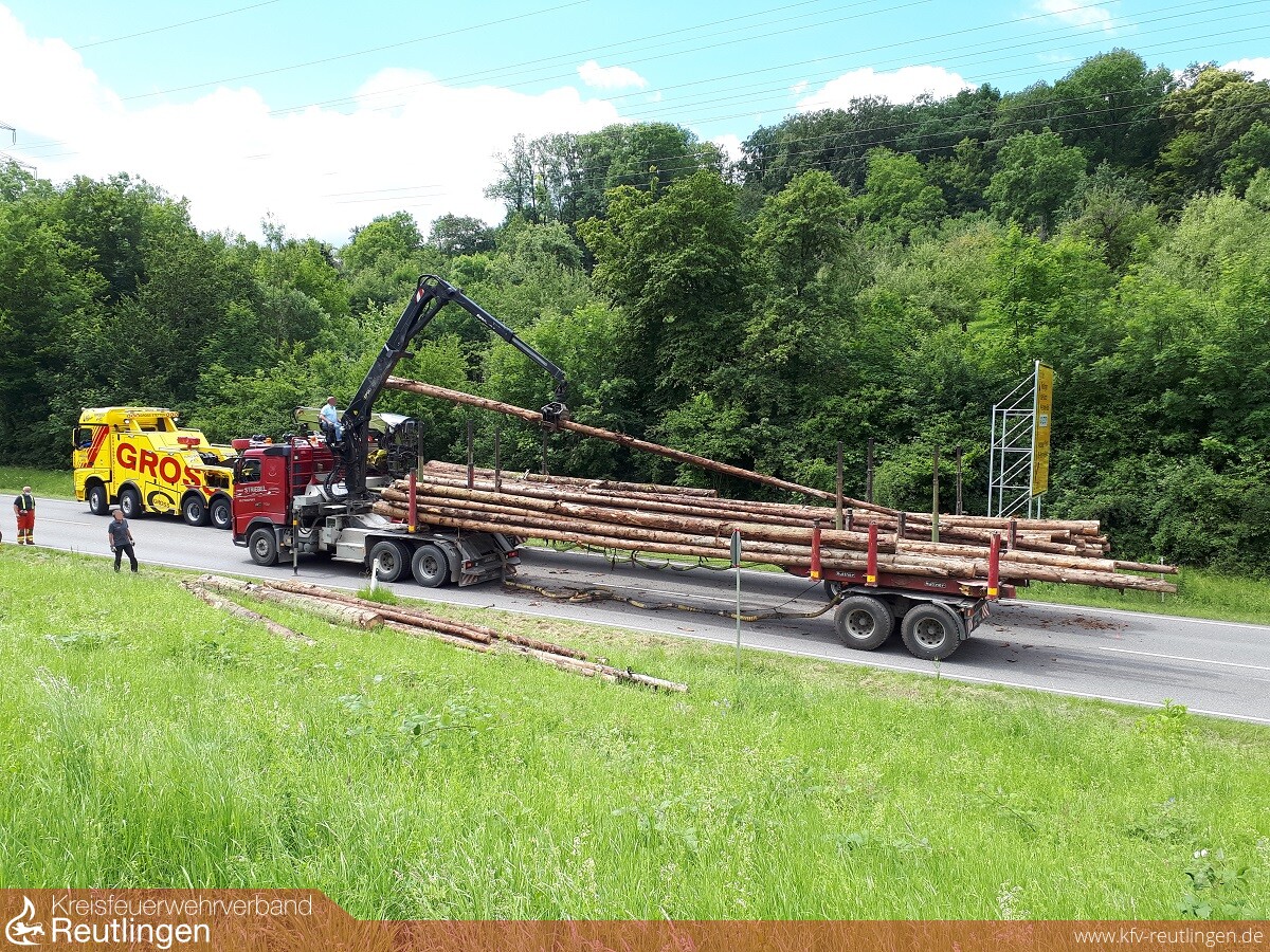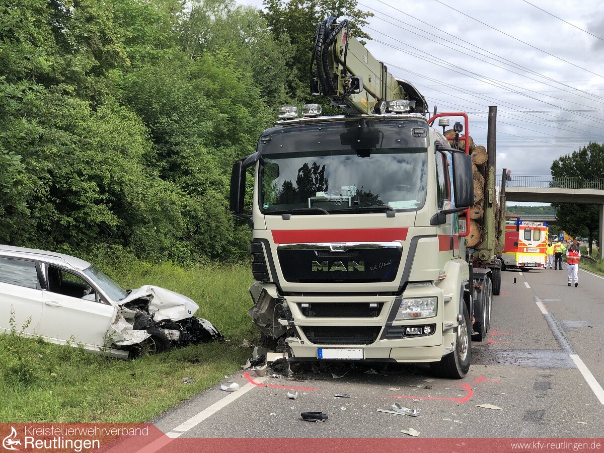 Ein Frontalzusammenstoß zwischen einem BMW und einem Langholztransporter, bei dem eine Person schwer verletzt wurde, hat ab dem Montagvormittag zu einer stundenlangen Vollsperrung der B 312 bei Metzingen geführt. Gegen 9.15 Uhr fuhr eine 36-Jährige mit ihrem Kombi von Metzingen herkommend in Richtung Stuttgart. Zwischen dem Stadtgebiet und der Nordtangente geriet der Wagen aus noch ungeklärter Ursache auf die Gegenfahrspur und kollidierte dort frontal mit einem entgegenkommenden Langholz-Laster. Dessen 56 Jahre alter Fahrer hatte noch vergeblich versucht, nach rechts auszuweichen. Durch den Zusammenstoß wurde der BMW in den linken Grünstreifen abgewiesen und kam dort um die eigene Achse gedreht zum Stehen. Die 36-Jährige wurde bei dem Unfall schwer verletzt und vom Rettungsdienst in eine Klinik eingeliefert. Der Lkw-Fahrer blieb nach derzeitigem Kenntnisstand unverletzt. An den beteiligten Fahrzeugen, die beide abgeschleppt werden mussten, beläuft sich der Gesamtschaden ersten Schätzungen zufolge auf 90.000 Euro. Das geladene Langholz des Lkw musste noch an der Unfallstelle auf zwei andere Sattelzüge umgeladen werden. Der betroffene Streckenabschnitt der Bundesstraße konnte erst gegen 13.30 Uhr wieder für den Verkehr freigegeben werden. Bis dahin war durch die Straßenmeisterei eine Umleitung eingerichtet worden. (Quelle: Polizeipräsidium Reutlingen)
