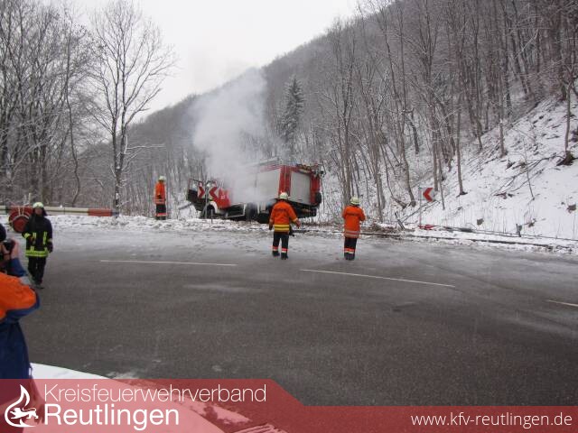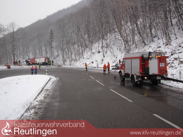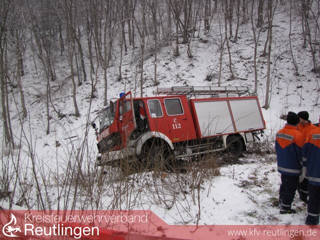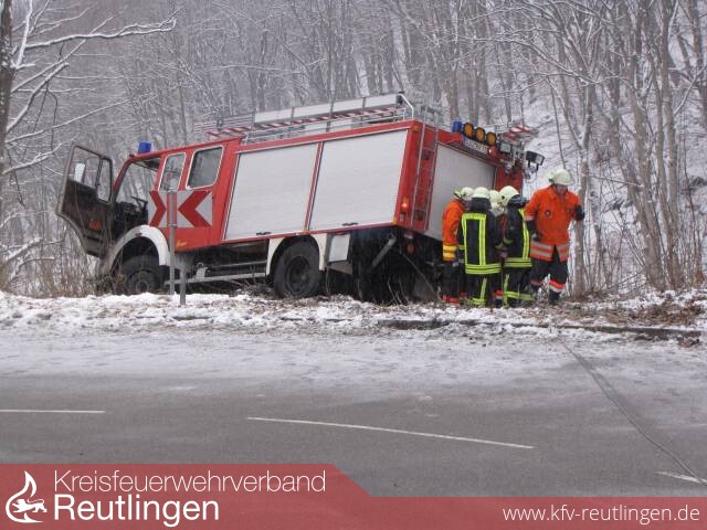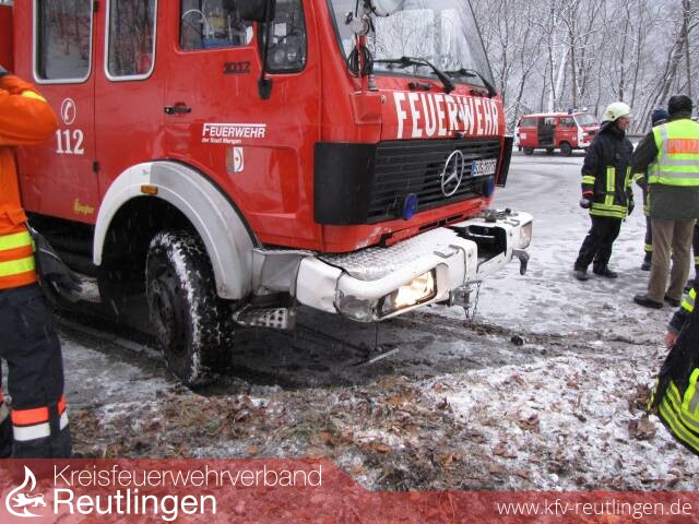 Um 9:34 Uhr wurde die Abteilung Unterhausen zu einem Hilfeleistungseinsatz nach einem Verkehrsunfall in der Honauer Steige alarmiert. Beim Eintreffen des Einsatzleiters an der Unfallstelle wurde ein LF16-TS der FF Mengen vorgefunden, das auf schneeglatter Fahrbahn ins Rutschen kam und die Leitplanke auf einer Länge von ca. 10m durchbrochen hatte.
