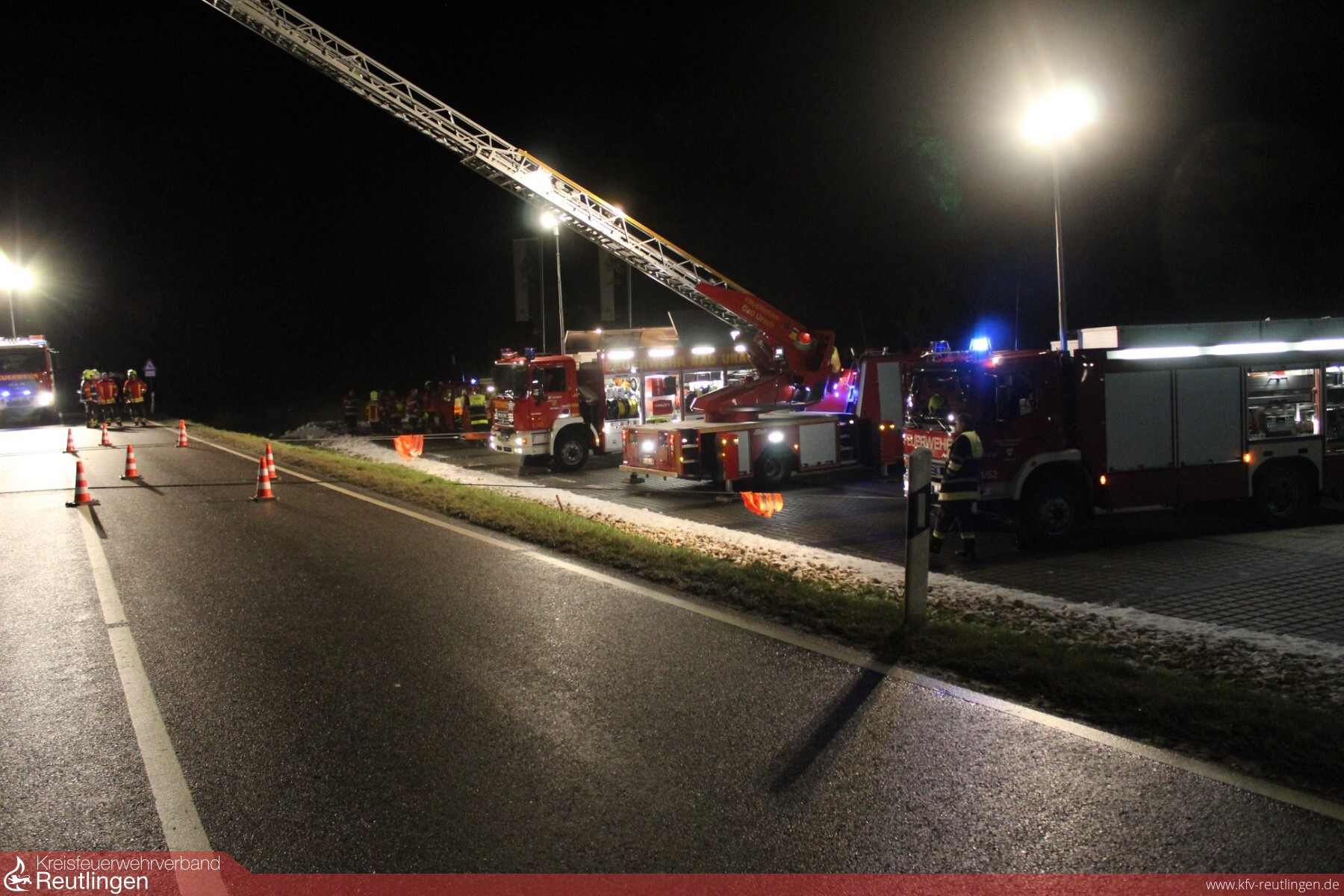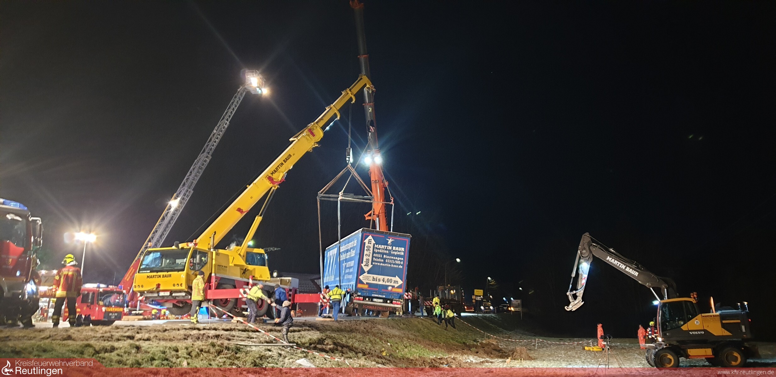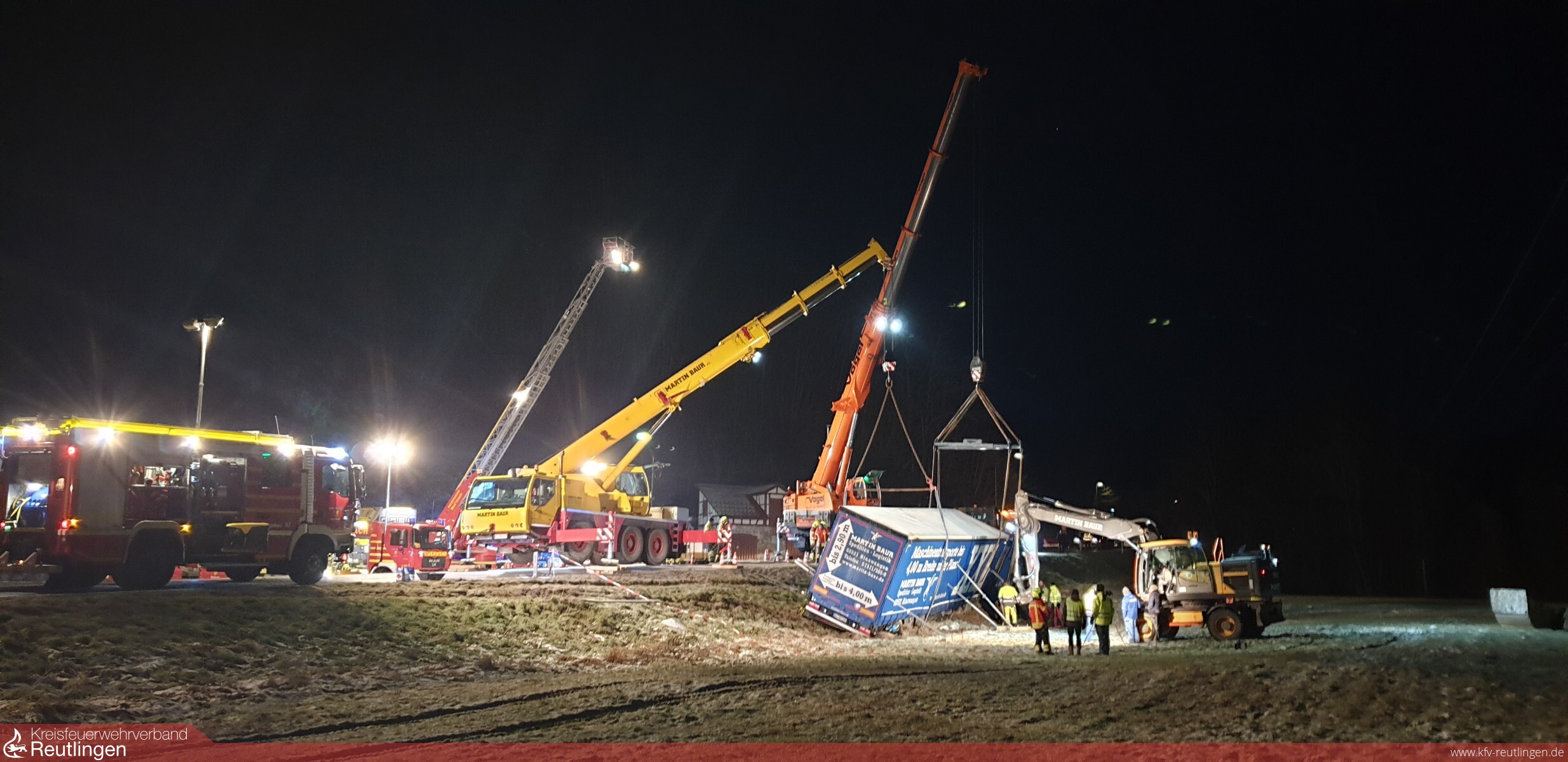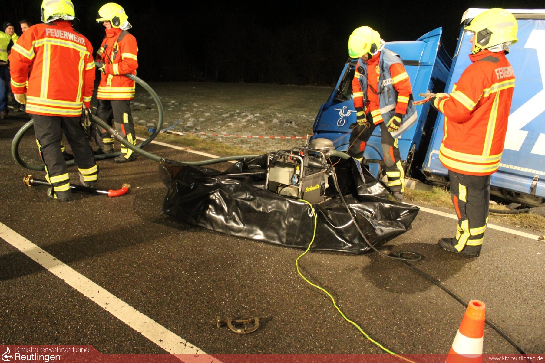 Am 12. Dezember wurden wir auf die B465 zwischen Bad Urach und Seeburg alarmiert. Kurz vor Seeburg, kam ein Sattelzug von der Fahrbahn ab und drohte an der abschüssigen Böschung umzukippen. Sowohl der Auflieger, als auch das Zugfahrzeug wurden durch uns mit Seilwinden und Baustützen gesichert, hierzu wurde ein zweiter Rüstwagen der Feuerwehr Münsingen nachalarmiert. Da zunächst unklar war, ob Betriebsstoffe ins Erdreich sickerten, wurde das Umweltamt an die Einsatzstelle beordert. Bevor der LKW geborgen werden konnte, mussten von uns mehrere hundert Liter Kraftstoff in Fässer umgepumpt werden. Schließlich gelang es, das Gespann mittels 2 Kranen zurück auf die Straße zu stellen. Die Bundesstraße musste für die Dauer der Bergung vollgesperrt werden, unser Einsatz konnte nach fast acht Stunden beendet werden. Neben der Abteilung Stadt war auch die Abteilung Seeburg im Einsatz, die Abteilung Wittlingen besetzte während der Einsatzdauer das Gerätehaus in Bad Urach.
