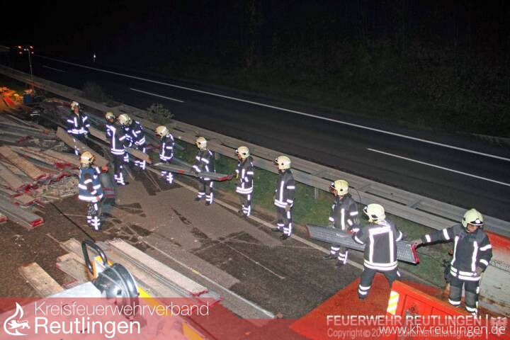Um 17:33 Uhr wurde die Feuerwehr zur Bergung eines LKW und dessen Ladung auf der B 312 / B 28 kurz nach der Anschlussstelle Sondelfingen angefordert. Der LKW mit Anhänger lag auf der Seite, die beladenen Gerüstteile waren über beide Fahrspuren verteilt.