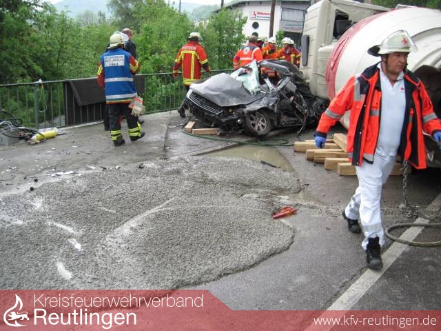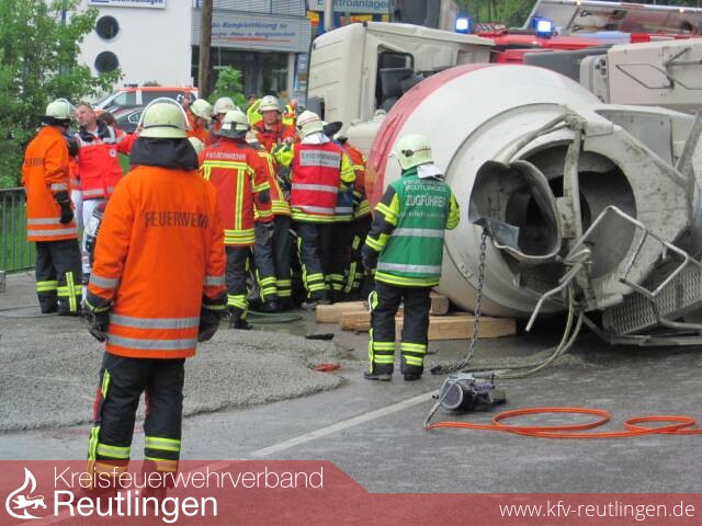 Der aus Richtung Metzingen kommende, rund 32 Tonnen schwere Betonmischer bog an der Stuttgarter Straße/Burgstraße nach rechts ab und kollidierte dort auf der Gegenfahrbahn mit einem PWK. Danach kippte der Betonmischer komplett um und begrub einen mit zwei Personen besetzten Pkw Opel Astra unter seiner Fahrzeugfront. Die Fahrerin wurde ihrem Pkw eingeklemmt und zog sich schwerste Verletzungen zu. Die auf dem Beifahrersitz befindliche Person erlitt leichte Verletzungen. Im Auslauf rutschte der Betonmischer noch gegen einen weiteren PKW, dessen Fahrer ebenfalls leichte Verletzungen erlitt.