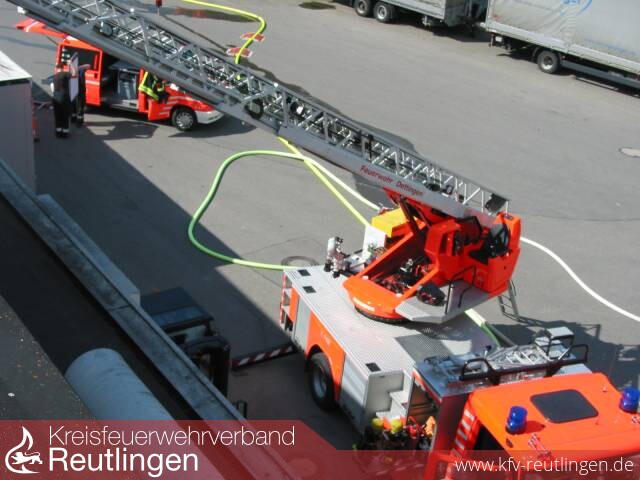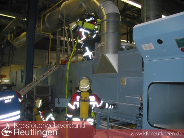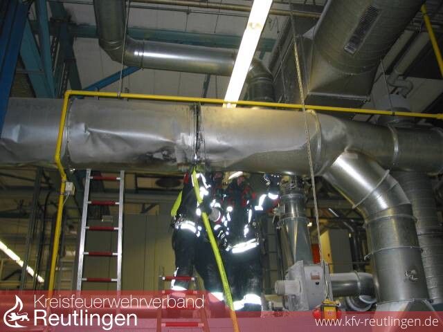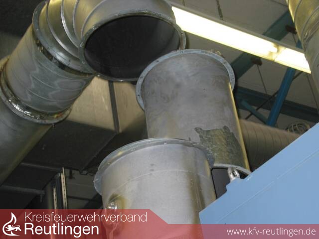 Dort brannte die Lüftung eines Siebdruckofens. Diese wurde von 2 Trupps unter Atemschutz abgelöscht. Um das gesamte Ausmaß des Brandes zu erkennen wurde das Lüftungsrohr abgekühlt und anschließend aufgeschraubt.