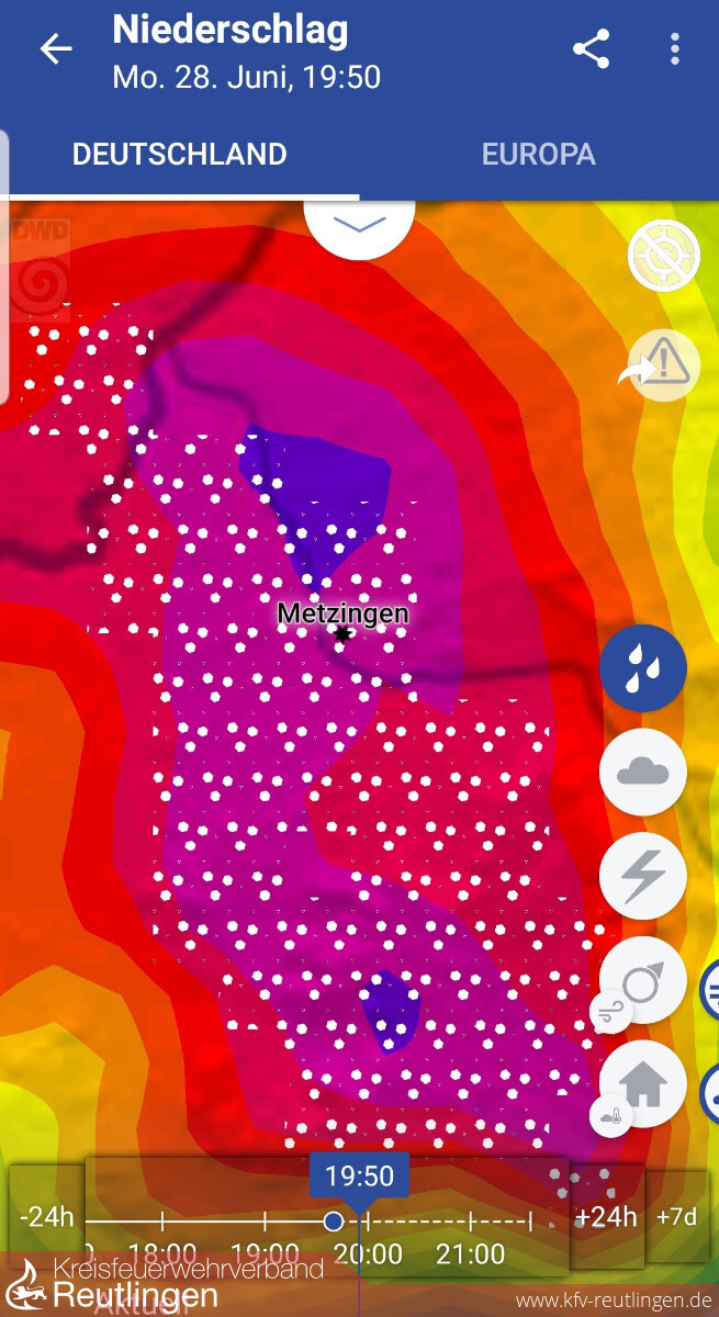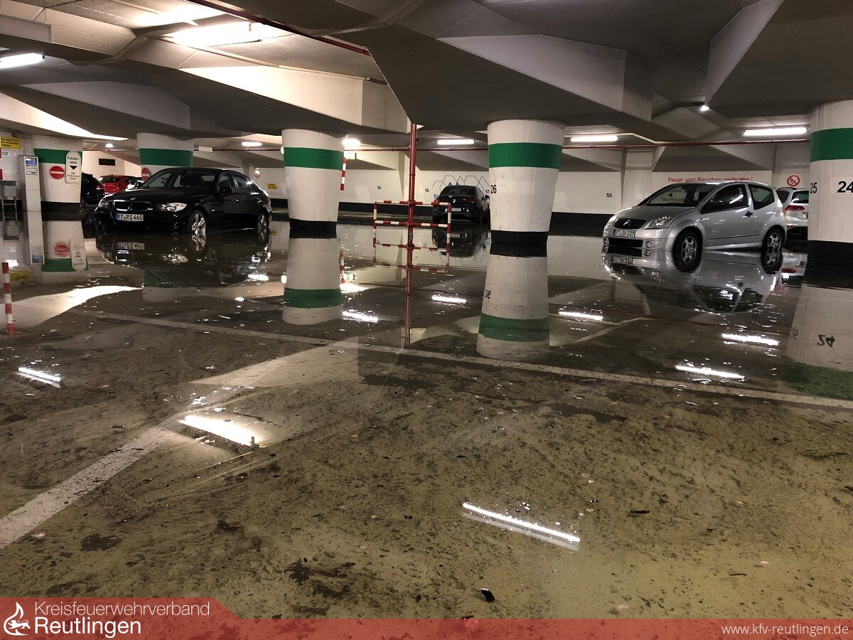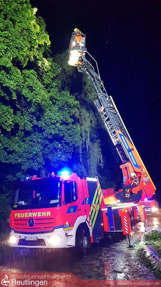 Gegen 19:50 Uhr traf erneut eine gewaltige Gewitterzelle mit extremen Starkregen das Stadtgebiet von Metzingen. Überflutete Straßen, vollgelaufene Keller, zwei ausgelöste Brandmeldeanlagen und einen Gasaustritt nach einem Gebäudeteileinsturz gab es abzuarbeiten. Um 20:10 Uhr wurde deshalb Großalarm für alle Metzinger Feuerwehrabteilungen ausgelöst. Zur Unterstützung forderten wir die Feuerwehren Dettingen und Grafenberg, jeweils mit einem Löschfahrzeug, an. Am 28. Juni und am Folgetag rückte die Feuerwehr zu rund 100 Einsätzen aus.