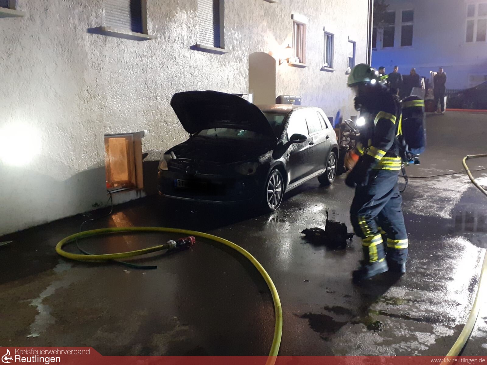 Beim eintreffen der ersten Einsatzkräfte, stand der Motorraum des an der Hauswand geparkten VW Golf bereits in Vollbrand.