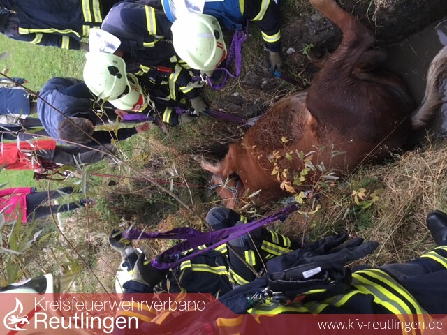 Am Dienstagabend wurde die Reutlinger Feuerwehr zum Hagäckerhof nach Ohmenhausen gerufen. Ein Pferd war dort in einen durch die Wiesen geführten Entwässerungskanal gestürzt und verletzt liegen geblieben.