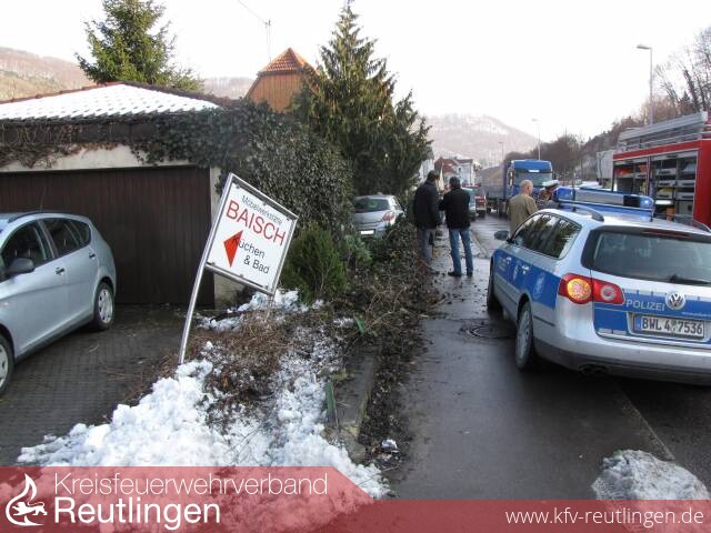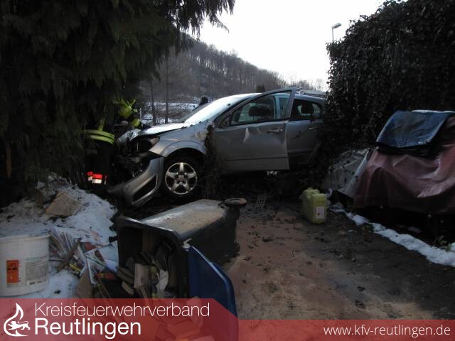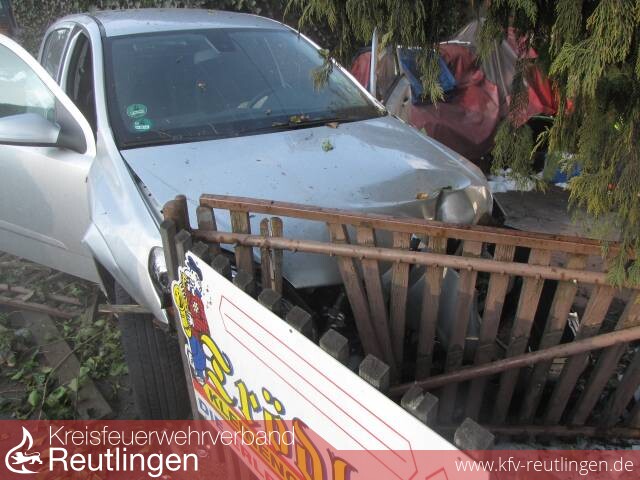 Der Mann hatte auf der B 312 aus Richtung Pfullingen kommend aus bisher noch nicht geklärter Ursache die Gegenfahrbahn überquert, war an einer Mauer entlang geschrammt und letztendlich an einem Gartenzaun hängengeblieben. Der Fahrer blieb unverletzt. Den Sachschaden schätzt die Polizei auf rund 15000 Euro. Die Feuerwehr nahm ausgelaufene Betriebsmittel auf und unterstützte den Abschleppdienst. Desweiteren wurde die Straße von Trümmerteilen befreit. Eine erhebliche Verkehrsbehinderung konnte während des Einsatzes nicht vermieden werden.