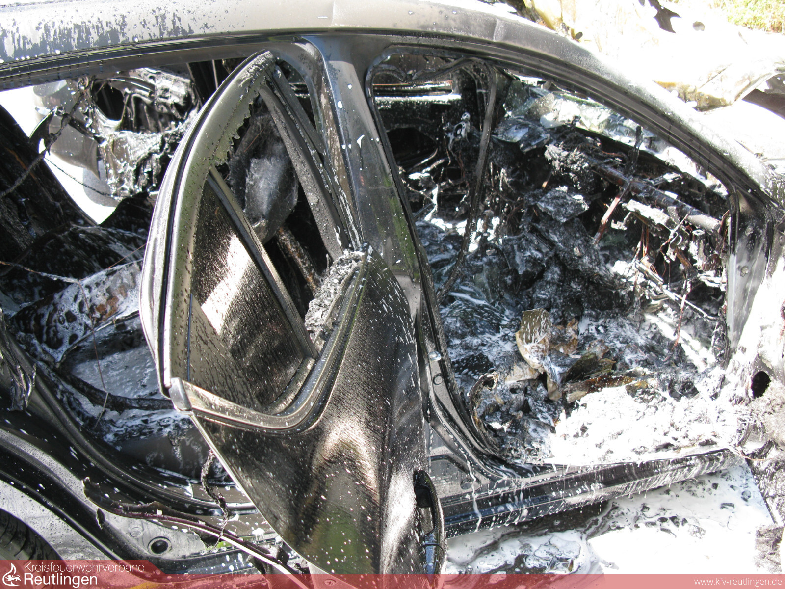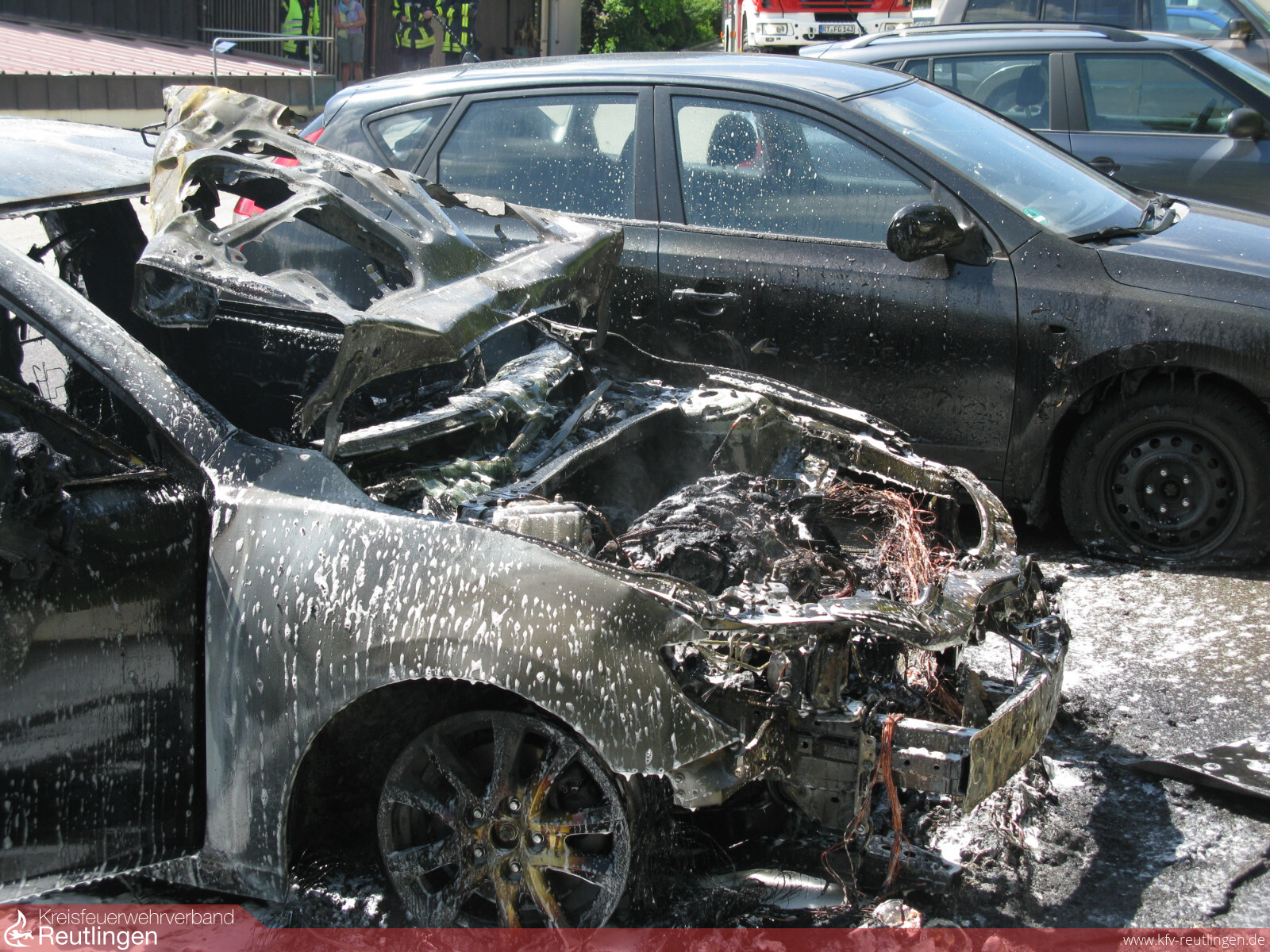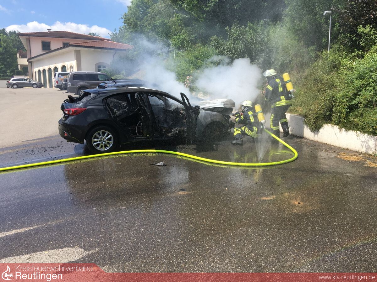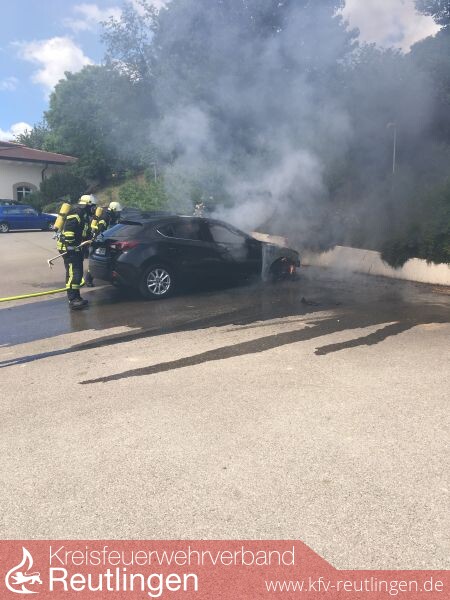 Zu einem Fahrzeugbrand wurde die Freiw. Feuerwehr Grafenberg am vergangenen Samstag, dem 17. Juni 2017 um 11.10. Uhr gerufen. Die Besitzerin eines Mazdas aus Sigmaringen wollte Ihr Fahrzeug gerade auf dem Parkplatz des Grafenberger Reiterhofes in der Auchtertstraße abstellen als sie bemerkte dass ihr Auto im Motorraum anfing zu brennen. Beim eintreffen der Feuerwehr stand das Fahrzeug bereits im Vollbrand. Der links daneben stehende PKW war durch Wärmestrahlung bereits beschädigt, das rechts parkende Fahrzeug war offensichtlich noch unbeschädigt. Durch sofortiges kühlen und wegfahren durch die Feuerwehr konnte der unbeschädigten PKW gerettet werden. Das bereits in Mitleidenschaft gezogene Fahrzeug konnte vor einem Totalschaden bewahrt werden. Der im Vollbrand stehende Mazda konnte zwar durch einen Trupp unter Atemschutz relativ schnell gelöscht werden, allerdings erlitt dieser leider aber einen Totalschaden. Da das Fahrzeug entgegen ersten Meldungen weit genug von den Gebäuden entfernt geparkt war entstand glücklicherweise kein weiter Schaden. Die Feuerwehr Grafenberg war mit zwei Fahrzeugen und 17 Kräften im Einsatz. Drei weitere standen noch in Bereitschaft. Weiter waren noch die Polizei Metzingen und ein Helfer des DRK am Einsatz beteiligt.