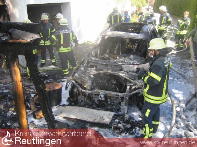 Als die Feuerwehr kurz nach Alarmierung am Brandobjekt eintraf, hatten die Flammen des brennenden Audi Q5 jedoch schon auf das Wohnhaus mit Bürogebäude, die Garage, einen Baum sowie vor dem PKW gelagertes Brennholz übergegriffen. Ob sich der Brand auch schon in das Gebäude bzw. Büro ausgebreitet hatte, war von aussen nicht zu erkennen. Deshalb ließ der Einsatzleiter Großalarm für die Feuerwehr Pliezhausen inclusive der Drehleiter der BF-Reutlingen auslösen.