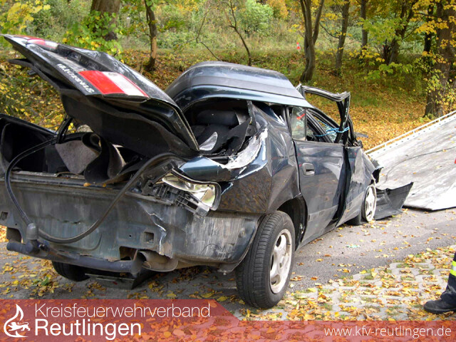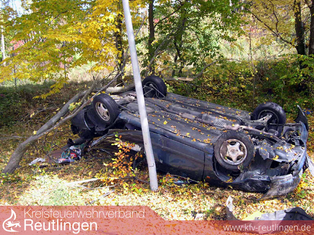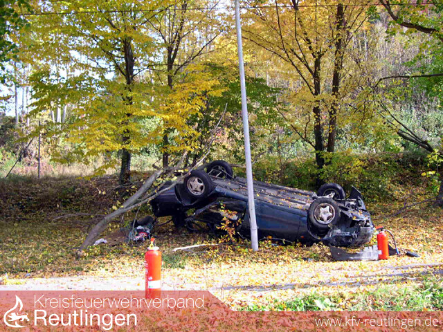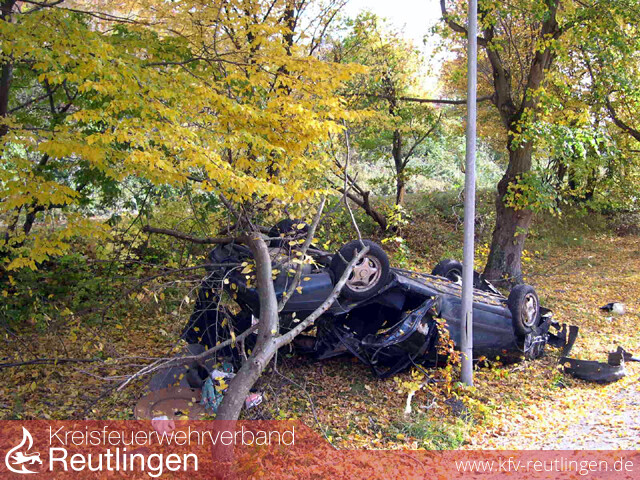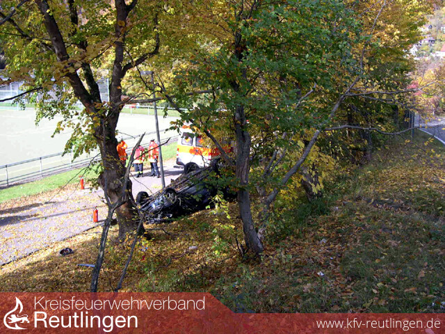 Eine riesige Portion Glück hatten am Sonntag Mittag zwei Männer aus Polen, als sie in der letzten Kurve der Ulmer Steige die Kontrolle über ihren Wagen verloren und den Abhang Richtung Sportplatz hinunter rasten. Dabei fällten sie einen kleineren Baum und prallten dann mit dem Heck des Fahrzeugs gegen einen weiteren großen Baum. Das Auto kam dann kurz vor dem Sportplatz auf dem Dach zum Stillstand. Glücklichereise hatte der Bad Uracher Fußballverein ein Auswärtsspiel, nicht auszudenken was bei einem Heimspiel mit vielen Zuschauern hätte passieren können. An der Einsatzstelle eingetroffen, stellte sich glücklicherweise heraus, dass entgegen der ersten Meldungen keine Personen mehr im Auto eingeklemmt waren. Es wurden ausgelaufene Betriebsmittel aufgenommen und das beauftragte Abschleppunternehmen unterstützt.