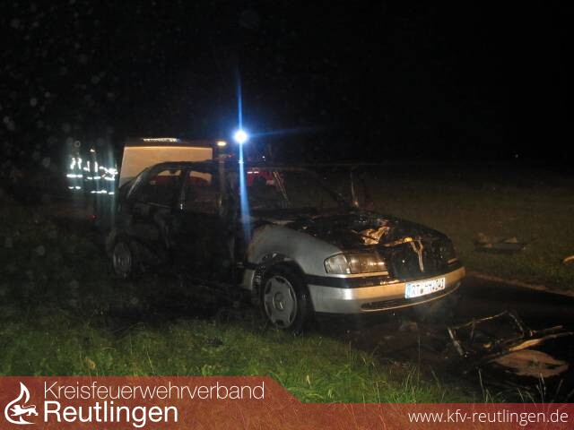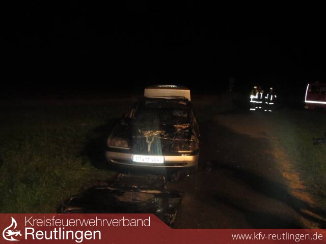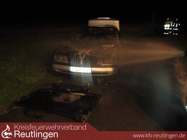 Am 05. September gegen 22:36 Uhr wurde die Feuerwehr Trochtelfingen zu einem Pkw Brand auf die K 6736 Trochtelfingen Richtung Hörschwag alarmiert. Nach Eintreffen der Feuerwehr stand das Fahrzeug bereits schon im Vollbrand und wurde dann schnellstmöglich abgelöscht mit Wasser und Schaum. Um an den Brandherd vorzudringen, wurde die Motorhaube mit Hilfe von hydraulischen Rettungsgeräten geöffnet. Bei den Löscharbeiten wurde festgestellt, dass der Tank nicht mehr dicht war und Treibstoff ausläuft. Dieser wurde dann in einen Behälter abgepumpt.