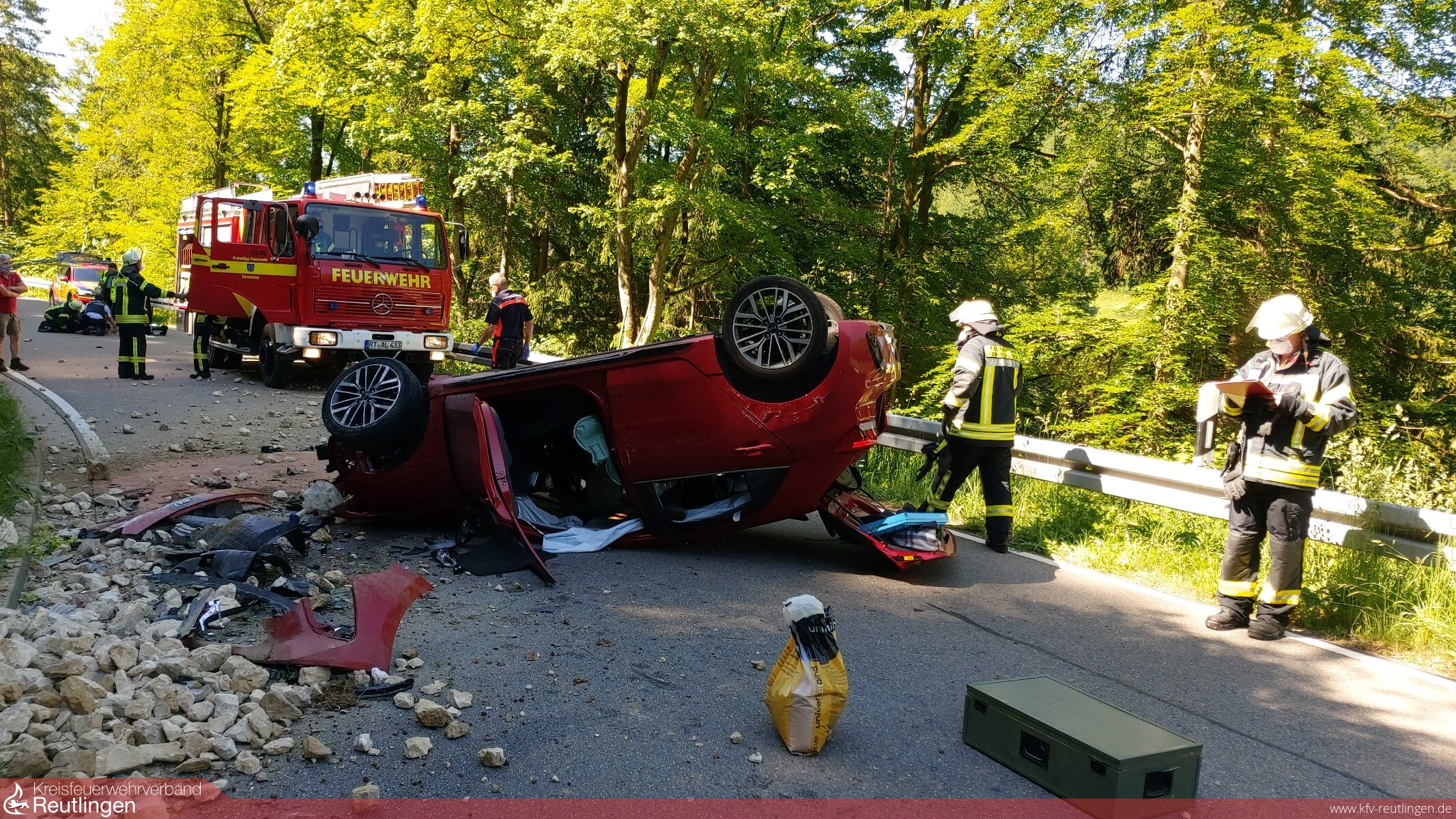 Die Feuerwehr Hayingen Abteilung Hayingen wurde zur Überlandhilfe mit dem Vorausrüstwagen 1/50 zu einem verunglückten PKW auf die L245 zwischen Gossenzugen und Hayingen gerufen. Ein Auto war aufgrund eines heftigen Zusammenstoßes mit Steingabionen (Hangsicherung) nach einem Überschlag auf dem Dach liegen geblieben.