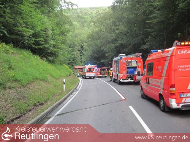 Am Sonntagnachmittag, gegen 16.10 Uhr, hat sich auf der Stuhlsteige (Landesstraße 382) ein schwerer Verkehrsunfall ereignet. Der 74-jährige Fahrer eines Mercedes SL fuhr die Stuhlsteige aufwärts in Richtung Genkingen und kam im Verlauf einer leichten Linkskurve aus bislang unbekannter Ursache nach rechts von der Fahrbahn ab. Das Fahrzeug prallte gegen die Leitplanke und überschlug sich, bevor es hangabwärts zwischen mehreren Bäumen zur Endlage kam. Der 74-Jährige wurde hierbei in seinem Fahrzeug eingeklemmt und erlitt lebensgefährliche Verletzungen. Zur Bergung des Verletzten sowie seines Pkw war die Feuerwehr mit schwerem Gerät am Einsatzort. Am verunfallten Pkw entstand wirtschaftlicher Totalschaden in Höhe von ca. 30.000 Euro. Die Stuhlsteige ist aktuell (Stand 18.40 Uhr) zur Durchführung der Bergungsarbeiten noch voll gesperrt.