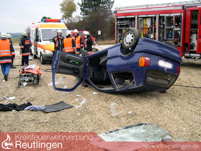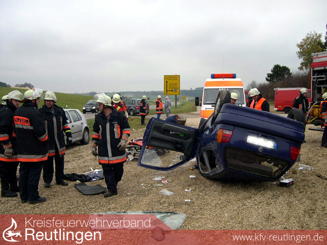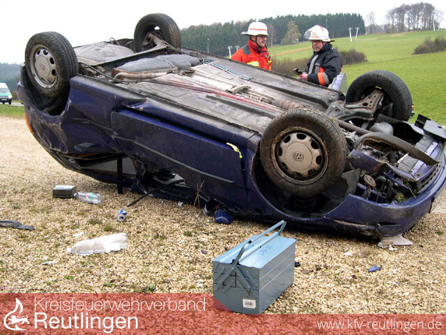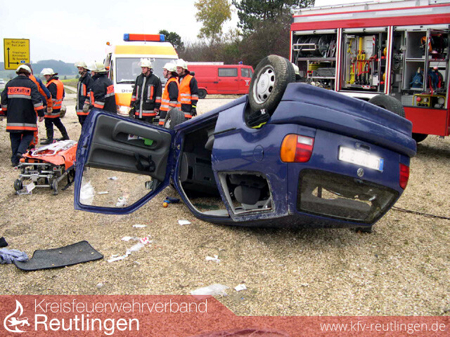Zu einem Verkehrsunfall mit eingeklemmter Person wurde die Feuerwehr Bad Urach zur Überlandhilfe nach Römerstein-Zainingen alarmiert. Es rückten der VRW und der ELW aus. An der Einsatzstelle eingetroffen stellte sich glücklicherweise heraus, dass die schwer verletzte Fahrerin nicht mehr im Fahrzeug eingeklemmt war. Mit lebensbedrohlichen Verletzungen kam sie mit dem Rettungshubschrauber in eine Klink. Nach ersten Ermittlungen kam sie wegen Unachtsamkeit nach rechts auf das unbefestigte Bankett. Beim Gegenlenken übersteuerte sie ihr Fahrzeug, kam ins Schleudern und kam nach links von der Fahrbahn ab. Dort stieß das Fahrzeug gegen eine Dohle und überschlug sich danach mehrfach.